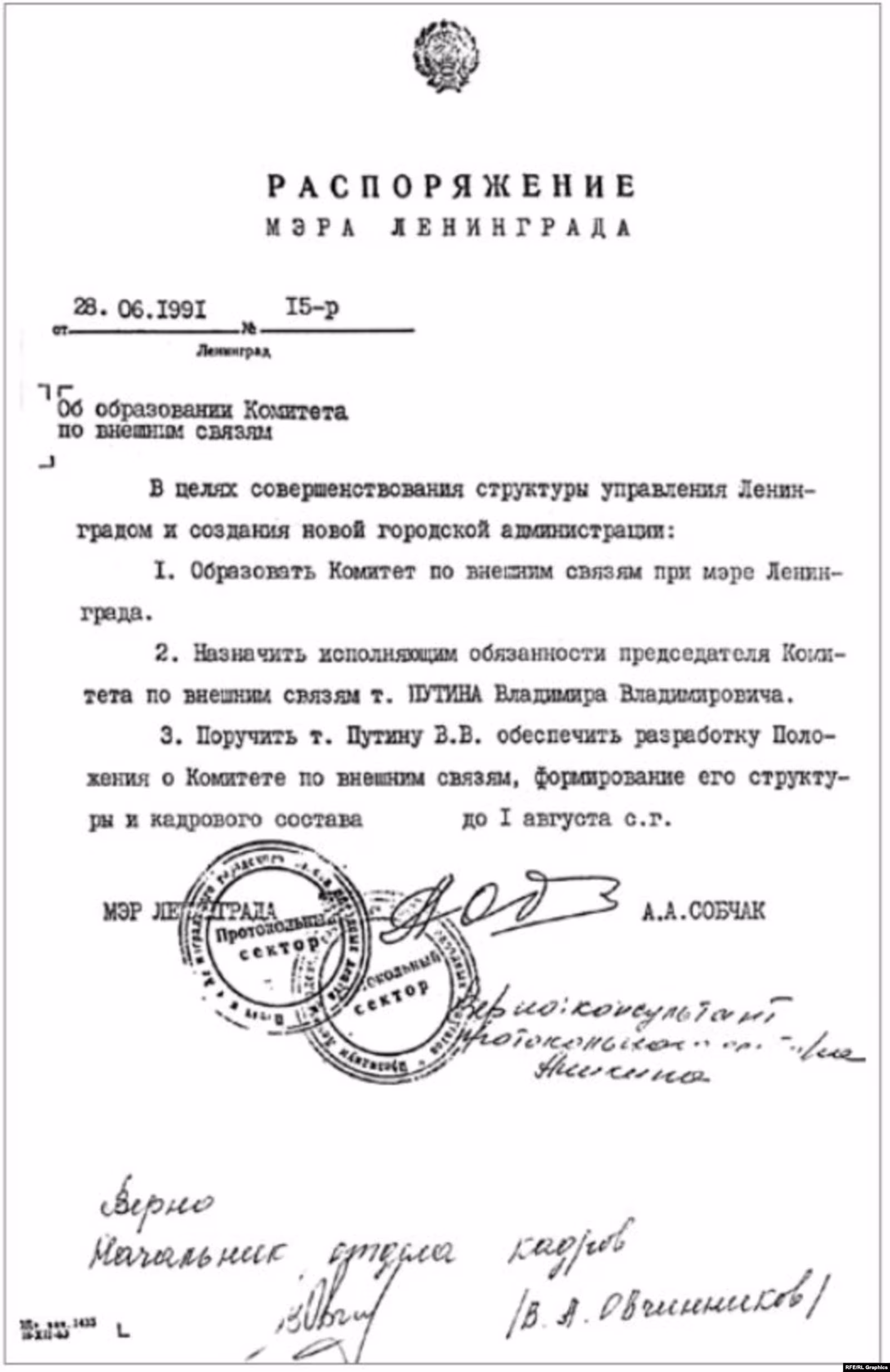"МИД России как правопреемник МИД СССР не сразу смог принять на себя все полномочия и ответственность бывшего союзного внешнеполитического ведомства, а областные и городские структуры, прежде осуществлявшие внешние связи под строгим контролем обкомов и горкомов КПСС, очень быстро утратили своих традиционных друзей и партнеров, за исключением сохранившихся связей между городами-побратимами в ведущих капиталистических странах Европы и Азии. В такой обстановке Ленинграду – Санкт-Петербургу, где упомянутые контакты были особенно развиты, потребовалась не только срочная, но и радикальная перестройка внешнеэкономического направления в деятельности новой администрации города во главе с Анатолием Александровичем Собчаком, который выбрал на роль руководителя Комитета по внешним связям (КВС) городского правительства Владимира Владимировича Путина и назначил его своим первым заместителем".