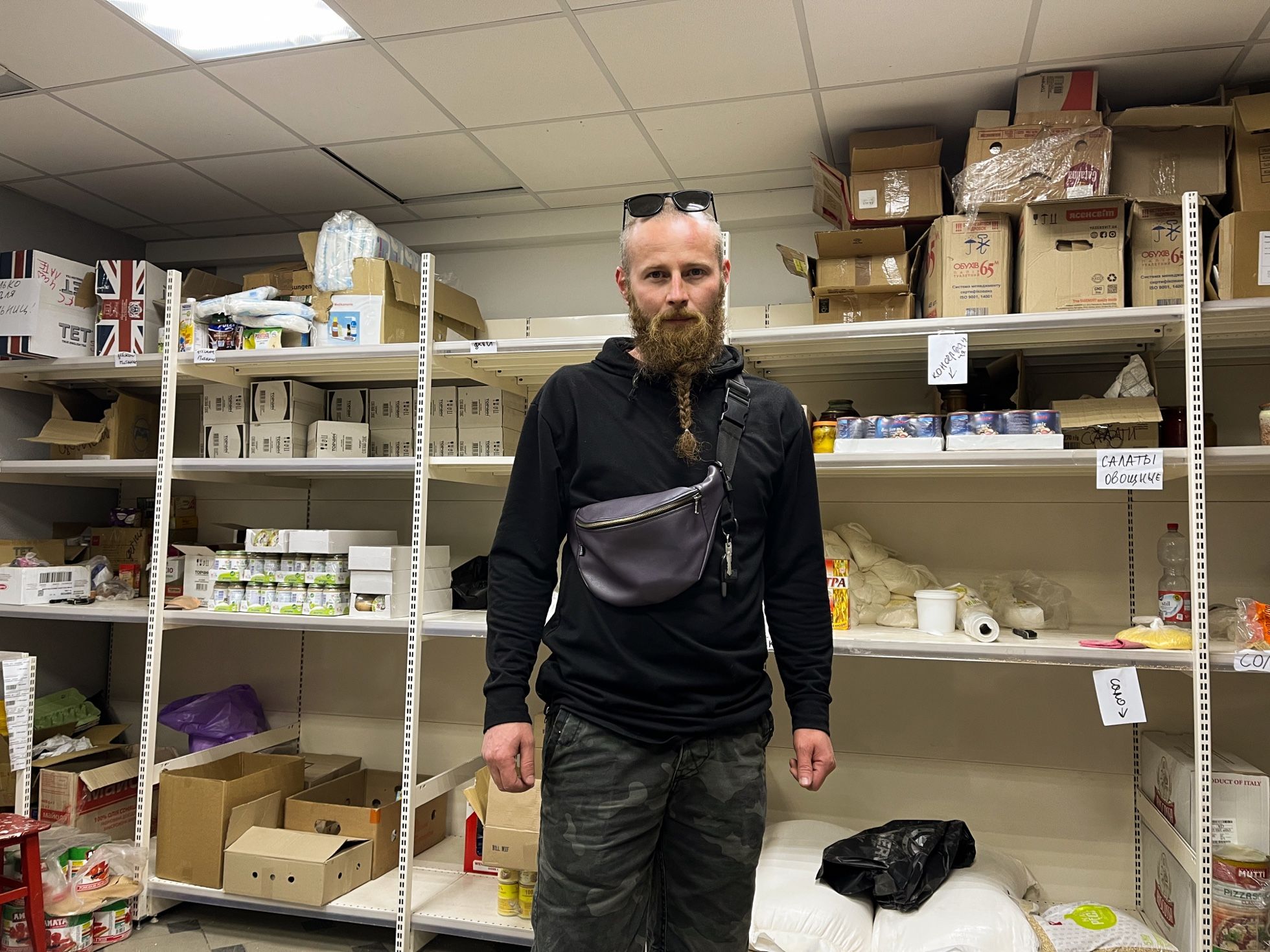 Другой волонтер, Егор, ведет меня на склад. Прежде здесь был магазин красок, но теперь на полках лежит детское питание, медикаменты, консервы.