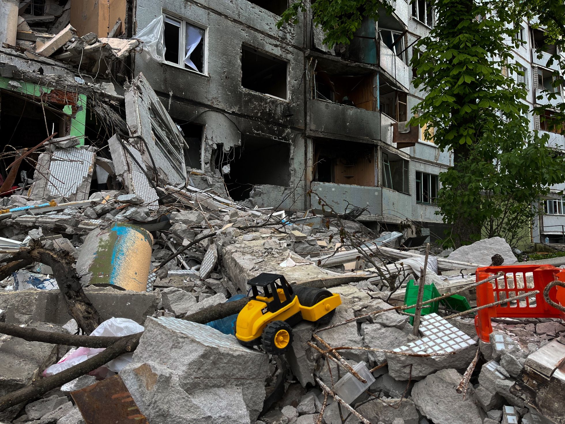 Звуки артиллерии слышны и на Горизонте — так называется район на восточной окраине Харькова. На въезде к Горизонту большие воронки, заполненные водой. Мимо разрушенной девятиэтажки идет Юрий. В конце февраля ракета прилетела и в его дом.