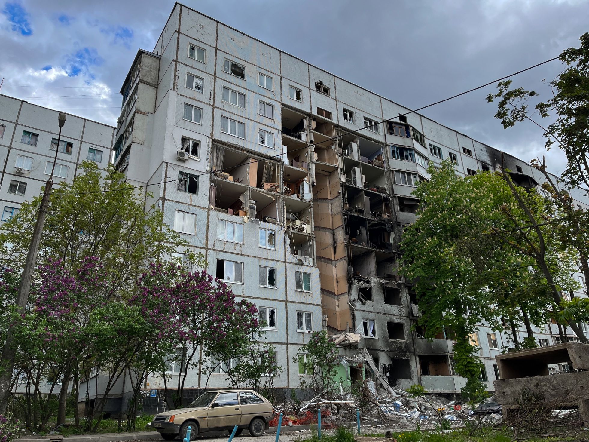 Самый пострадавший и густонаселенный район Харькова — Салтовка. Въезд в северную часть района пока закрыт. Обстрелы здесь прекратились совсем недавно, от журналистов требуют надеть каску и бронежилет. За зелеными деревьями и цветами сирени видны почерневшие от взрывов девятиэтажки. Со столбов свисают разорванные провода, всюду осколки от снарядов — острые и ржавые. Рядом с дорогой стоит разрушенная школа.
