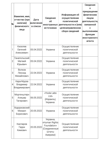 Всего в реестре семь человек: там также состоят ведущий Евгений Киселев, журналист Матвей Ганапольский, соратник Алексея Навального* Леонид Волков*, политик Владимир Кара-Мурза и рэпер Моргенштерн.
