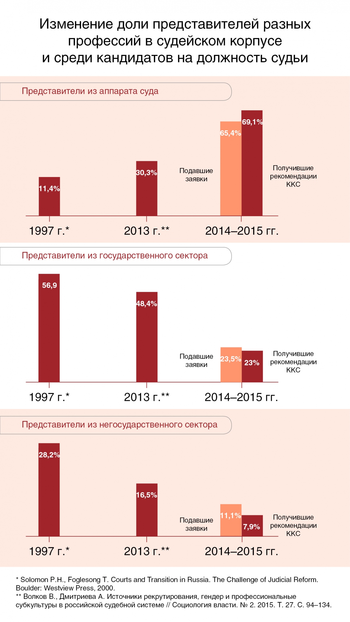 «Преимущество при отборе отдается кандидатам из аппарата суда, поскольку, во-первых, секретари и помощники знают «кухню» судебного делопроизводства и обладают навыками работы по «типовым» делам. Во-вторых, при крайне низкой заработной плате секретарей и помощников кадровая политика, которая наглядно демонстрирует возможности сотруднику аппарата стать судьей,позволяет избежать дефицита «аппаратных» кадров и удерживает судебную систему в работоспособном состоянии. В-третьих, сотрудник аппарата знаком тем, кто подбирает кадры, в отличие от «человека с улицы». В-четвертых, сотрудники аппарата судов и правоохранительных органов скорее оцениваются теми, кто подбирает кадры, как «свои» и «системные», чем адвокаты и юристы из частного сектора»,