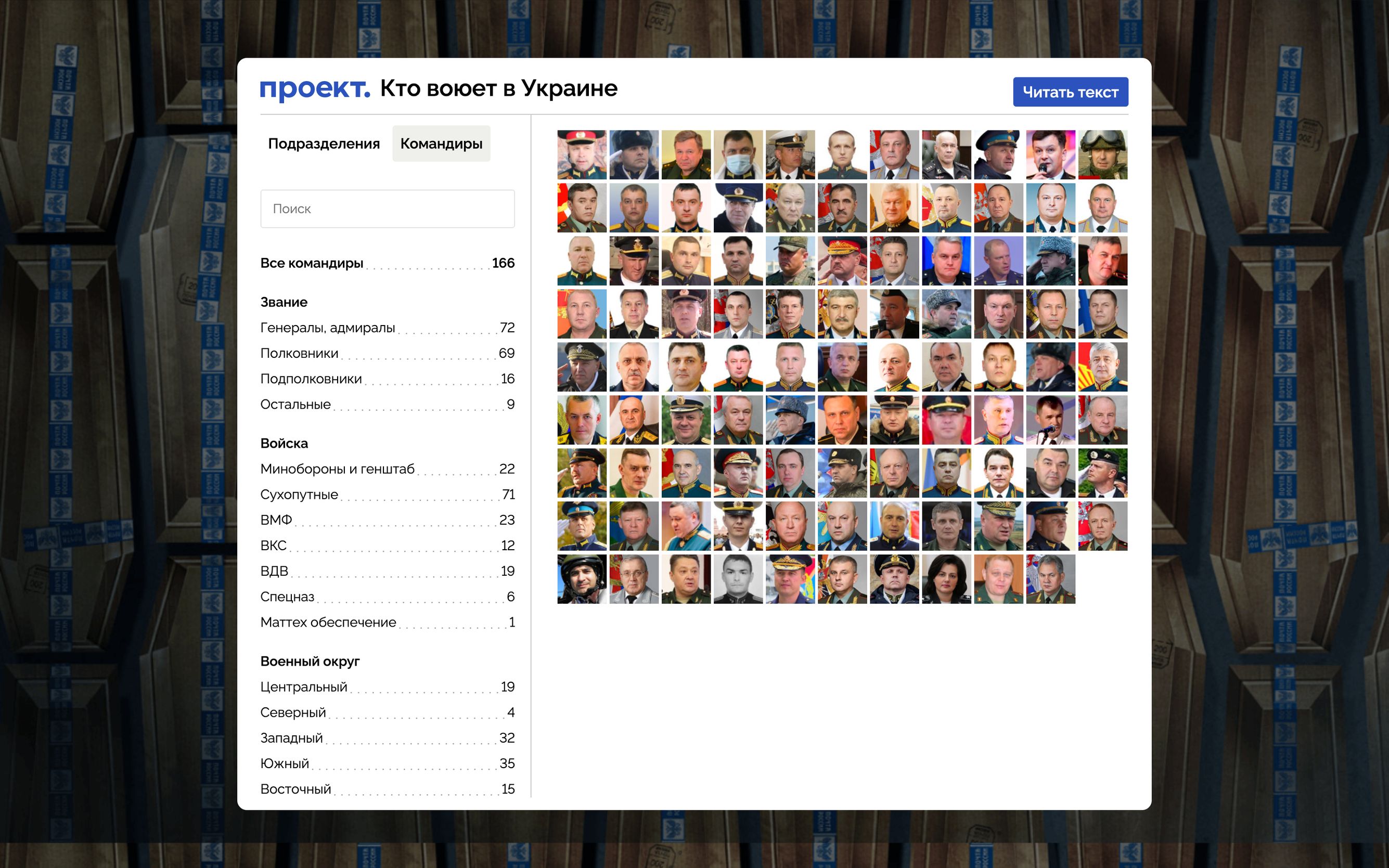 Издание «Проект» опубликовало базу с информацией о подразделениях российской армии, участвующих в войне против Украины.