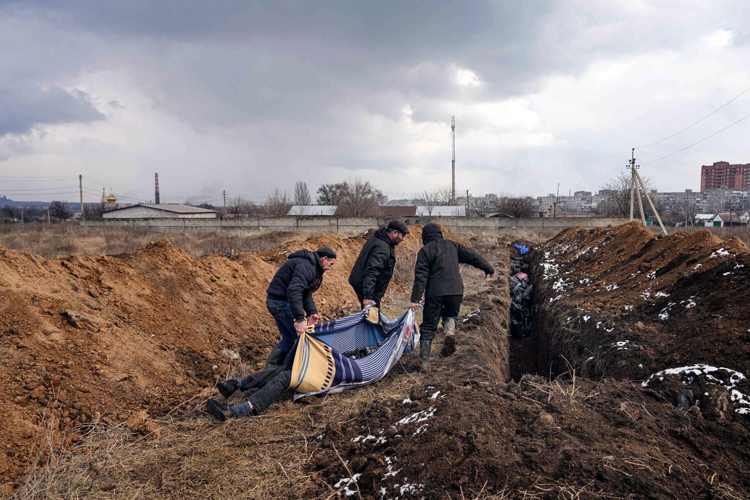 В материале AP рассказывалось, что из-за переполнения моргов и большого количества еще не собранных тел сотрудники коммунальных служб решили хоронить людей в братских могилах. Среди погибших, как сообщало агентство, были как погибшие в результате обстрелов, так и люди, умершие от естественных причин. На видео AP захоронением занимались люди не в военной форме, а в рабочих и защитных костюмах, а также в обычной одежде.
