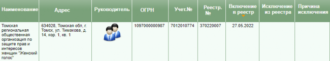 Министерство юстиции пополнило реестр НКО, выполняющих функции «иностранного агента», томской организацией «Женский голос». Сведения о внесении данной организации в реестр 27 мая можно посмотреть на Министерства юстиции.