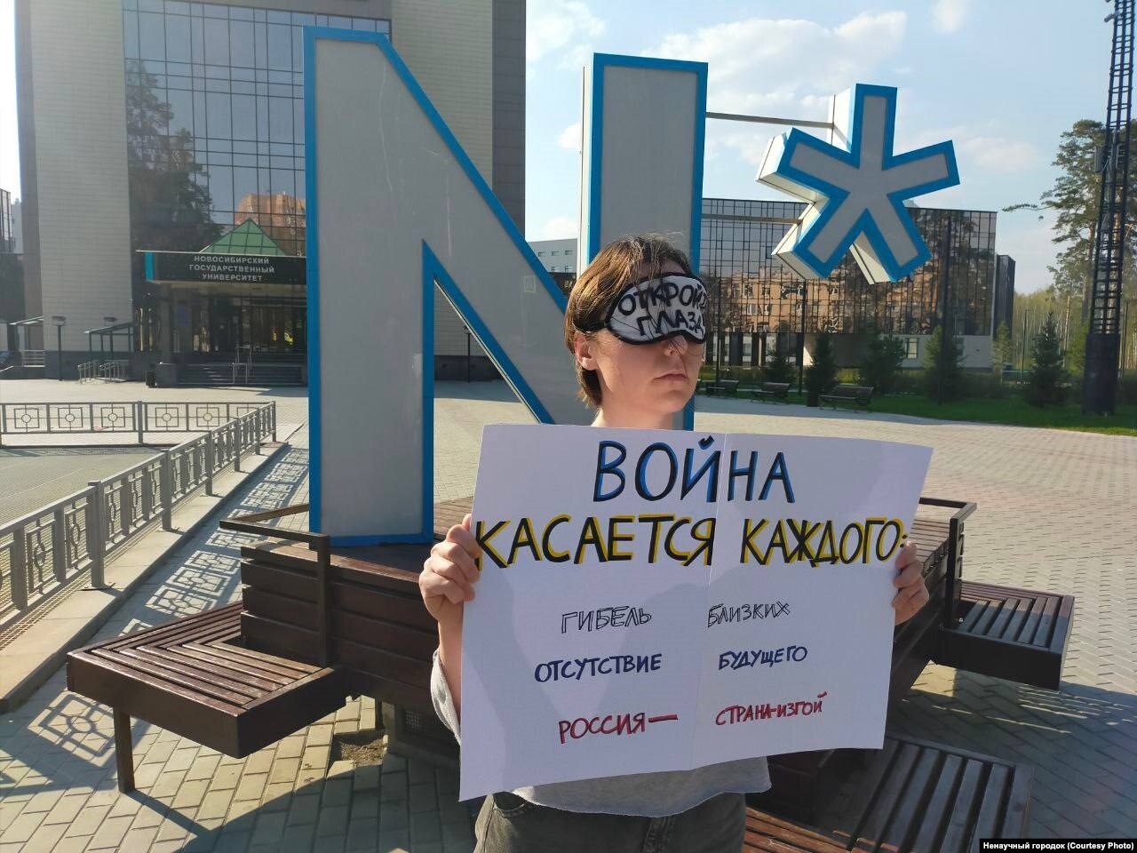 Анна Евтушенко провела одиночный пикет с плакатом "Война касается каждого: гибель близких, отсутствие будущего, Россия — страна-изгой" у административного здания НГУ 7 мая. На лице у пикетчицы была повязка с надписью "Открой глаза".