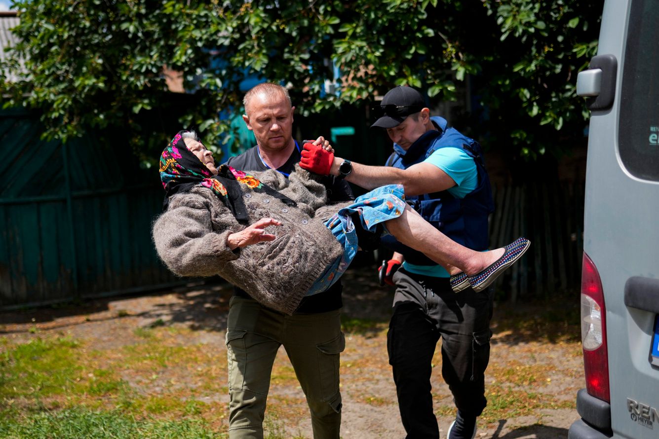 Francisco Seco / AP / Scanpix / LETA Волонтеры выносят престарелую жительницу Бахмута, чтобы эвакуировать ее из города, находящегося под постоянными артобстрелами со стороны российских войск