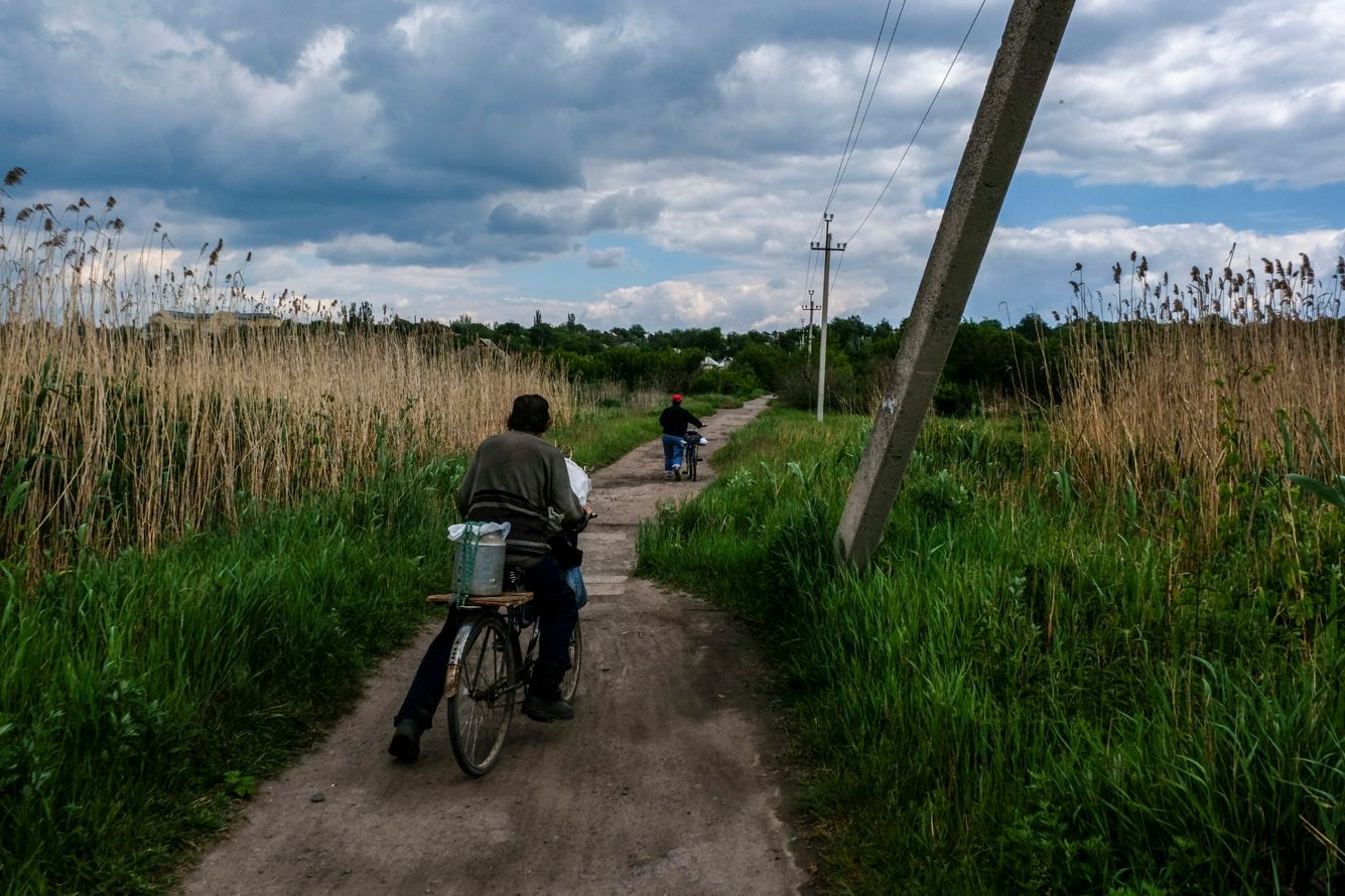 Rick Mave / SOPA Images / LightRocket / Getty Images Жители Северска едут на велосипедах за водой. Линия фронта проходит по северной окраине города, немногие оставшиеся в нем обитатели живут без света, воды и газа