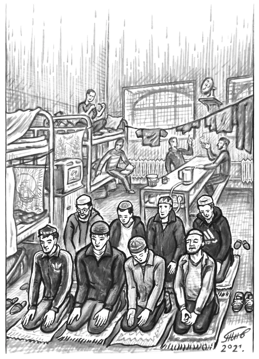 В положенное время на пятаке между столом и дальняком расстелились восемь ковриков для намаза. Вообще-то в хате почти все были мусульманами — кроме Гии, Вити, Вани Гагауза и меня, — но молились из них не все. Тем не менее и восемь молящихся в камере выглядели колоритно. Вначале Умед в качестве муллы громко и отчётливо прочитал азан — призыв к молитве (хочется сказать «пропел» — так как мусульманские молитвы представляют собой нечто среднее между выразительным чтением и пением). Затем, читая намаз, все синхронно начали совершать различные поклоны, складывать определённым образом руки: восемь фигур наклонялись под 90°, садились на колени, бились лбом о пол, вставали и снова совершали те же движения. И всё это под чтение молитв, напоминающих заклинания. Зрелище завораживающее, надо сказать.