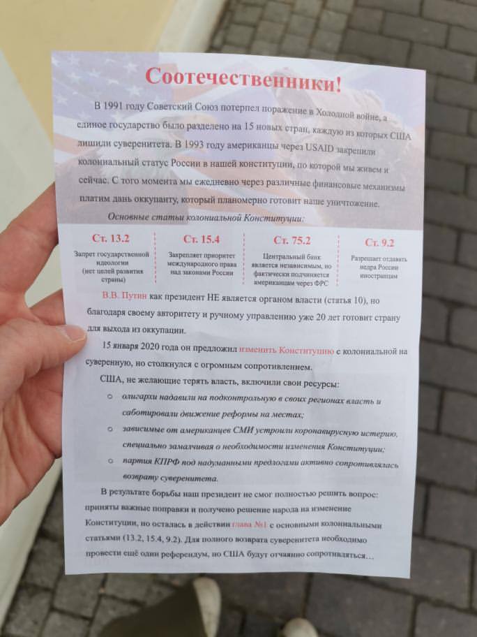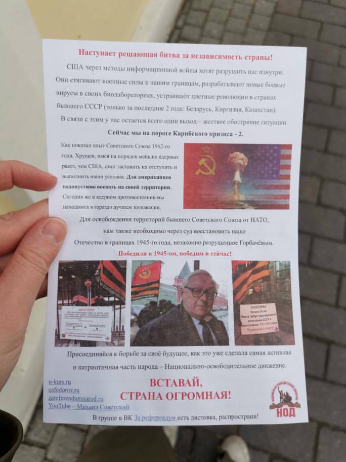 «Бумага» узнала, что листовки раздают активисты НОД — российского ультраправого политического объединения, которое выступает за восстановление «суверенитета России» и границ страны 1945 года. Движение основали в 2012 году, с 2019 оно собирает подписи за проведение референдума (о котором идет речь в листовках).