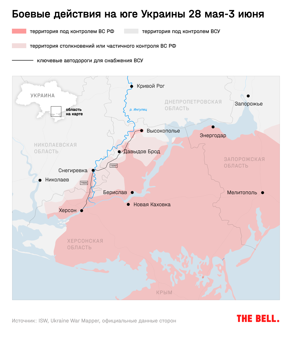 На южном направлении украинские войска вели наступление сразу с двух сторон — из Николаевской и Днепропетровской областей, в направлении Давыдова Брода и Снегиревки на разделяющей позиции сторон реке Ингулец. Успех наступления и выход ВСУ к дороге Херсон-Высокополье означал бы утрату ВС России позиций для дальнейшего наступления и необходимость укреплять оборону вокруг Херсона, а также оттягивать подкрепления от Донбасса.