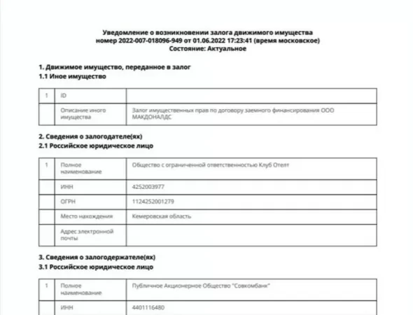 Предметом залога в сделке между «Клуб-Отелем» и Совкомбанком служат «имущественные права по договору заемного финансирования ООО "МАКДОНАЛДС"». После запроса «Би-би-си» сообщение о залоге удалили.