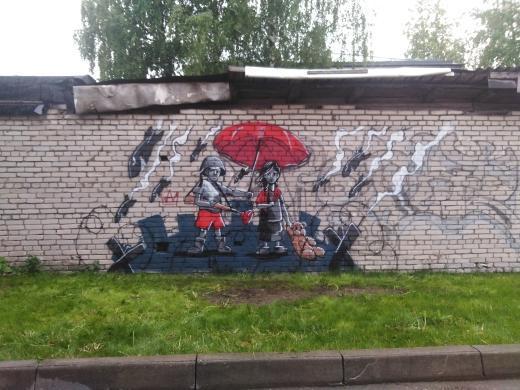 Граффити появилось вечером 3 июня на улице Красных партизан на здании рядом с церковью Эммануэла, которую занимают христиане-пятидесятники. На граффити был изображена девочка с игрушечным медвежонком под обстрелом ракет и за колючей проволокой. Рядом с ней стоял солдат: одной рукой он держал над ребенком красный зонт, другой – направлял на нее оружие.