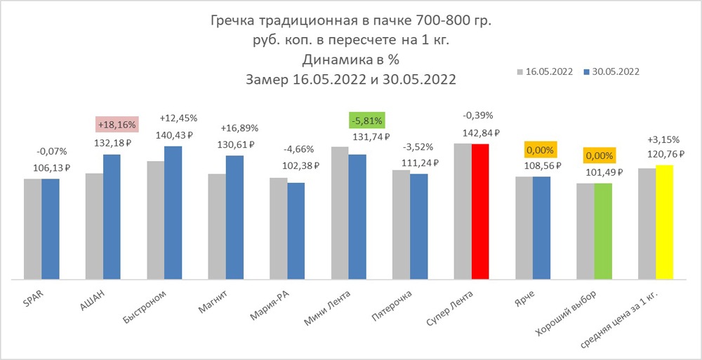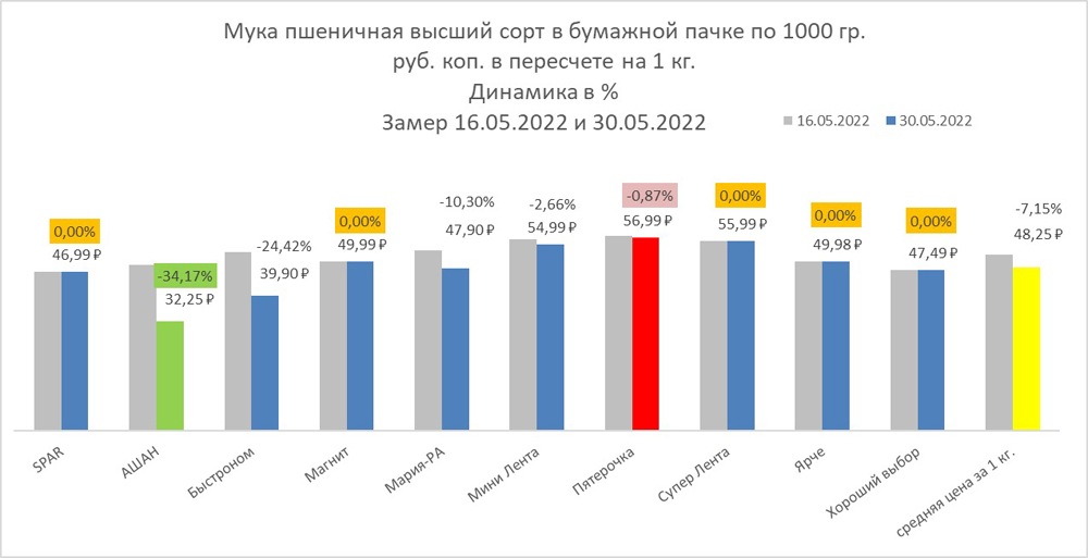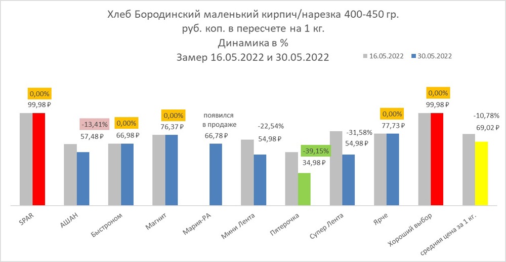 Мониторинг проводился в 20 торговых точках во всех районах города. Сравниваем цены за 16 мая и 30 мая.