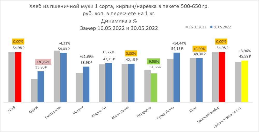 Цены фиксируют в магазинах Spar, «Ашан», «Быстроном», «Магнит», «Мария-Ра», «Мини Лента», «Пятерочка», «Супер Лента», «Ярче» и «Хороший выбор». Принцип выбора товара — самая низкая стоимость в момент проверки.