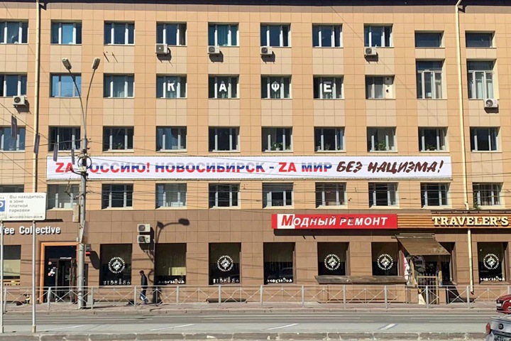На этом же фоне мэр Анатолий Локоть опубликовал фотографию с новым баннером на доме профсоюзов. «„За Россию, за мир без нацизма!“ — так можно выразить настроение сибиряков, жителей нашего города», — утверждает чиновник.