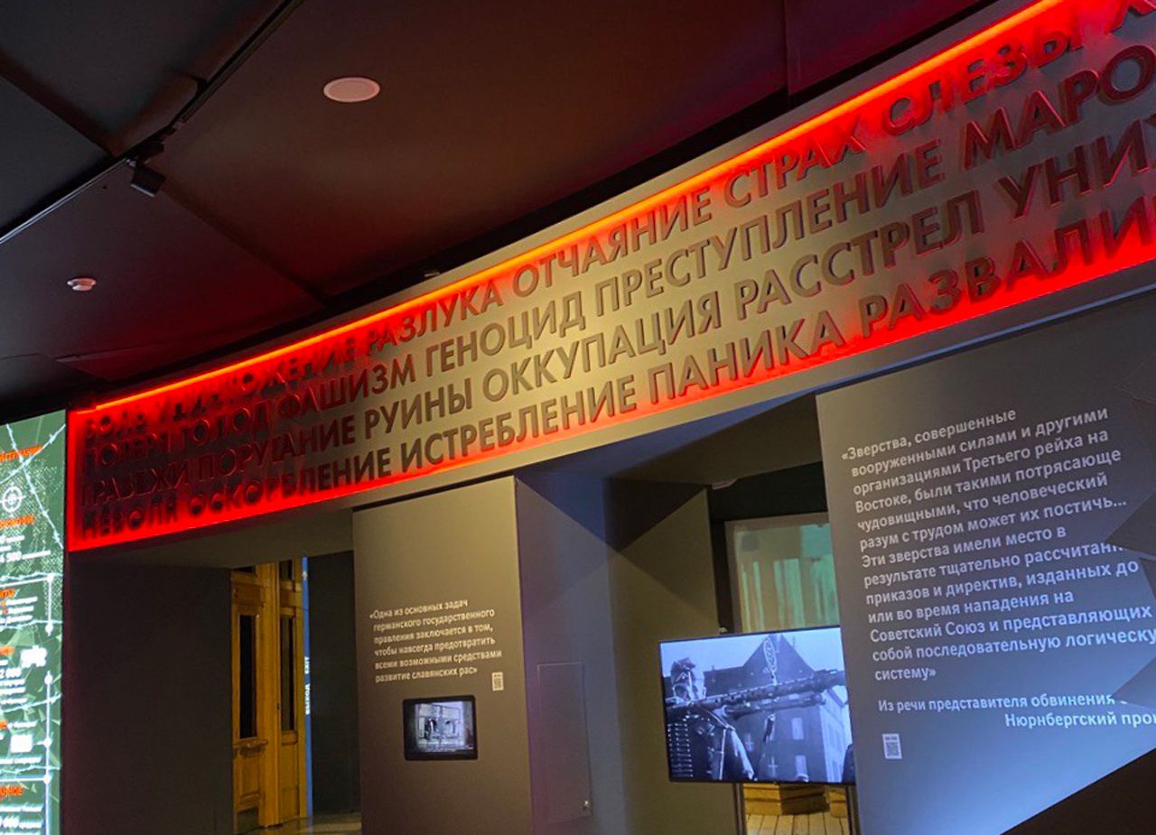 To get to the exhibition, you need to pass through the museum’s permanent exhibit dedicated to the Great Patriotic War (World War II). The hall opens with a semicircular structure adorned with an array of words: “Grief,” “Strike,” “Aggression,” “Protest,” “Crime,” “Tragedy,” “Torture,” “Genocide,” “Occupation,” “Shooting,” “Ruins,” and dozens of others.
