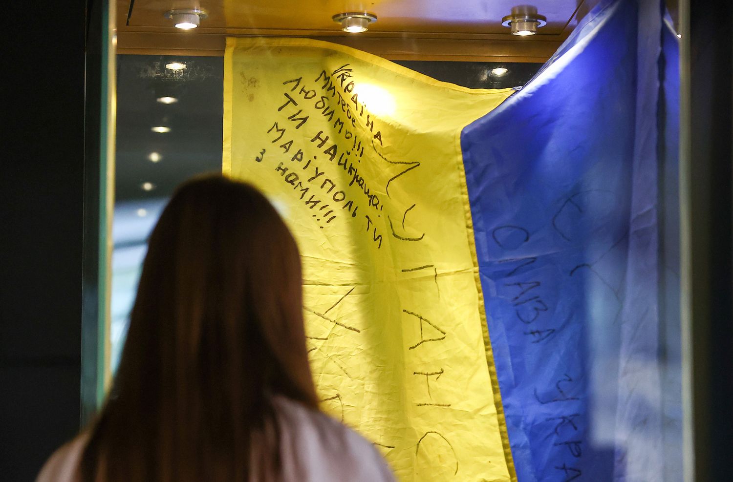 In the middle of the hall there is also a Ukrainian flag that has phrases in Ukrainian written on it with a marker: “Unified Ukraine,” “Glory to Ukraine, glory to the heroes,” and “Ukraine, we love you! You’re the best! Mariupol, you’re with us!” Next to this flag, on a shelf behind glass, there is a contemporary mug bearing a swastika. It’s unclear how or why this mug wound up in the exhibition, or what relation it has to Ukraine.