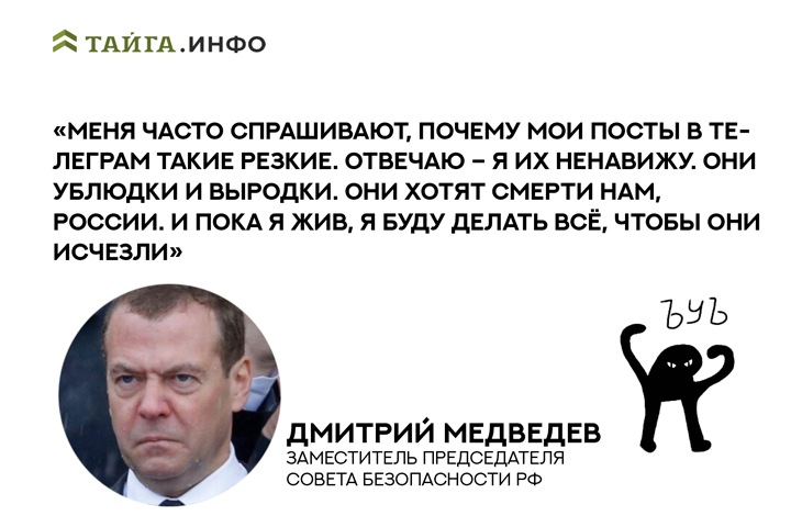 «Слова Медведева очень серьезны и опасны. Это неприемлемые заявления, которые нас очень беспокоят еще и потому, что они исходят от заместителя председателя Совета безопасности России. Это не сигнал к диалогу, это не открытие пути к прекращению огня, это не попытка установить мир, это недвусмысленная угроза тем, кто настойчиво стремится к миру», — сказал он.
