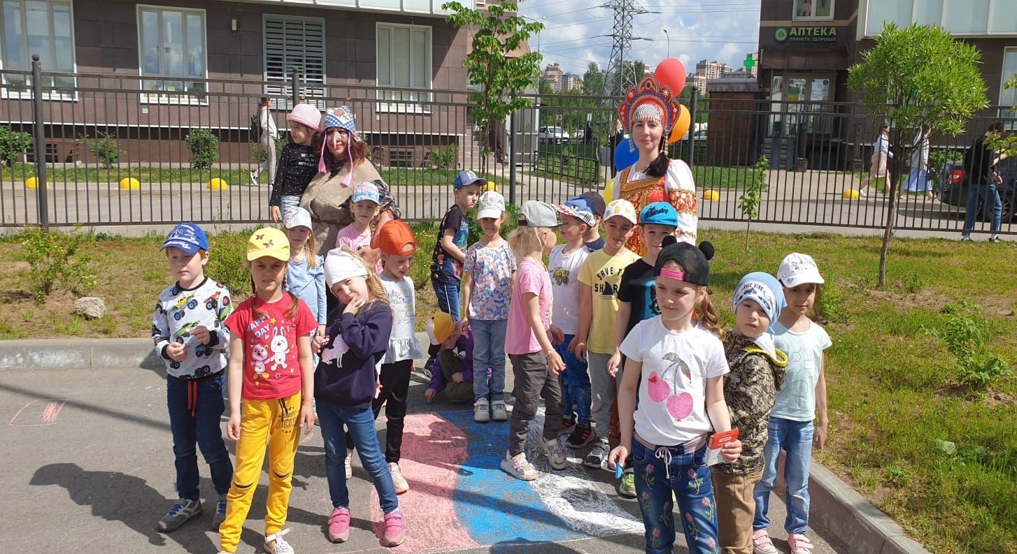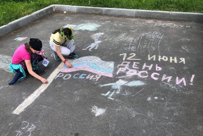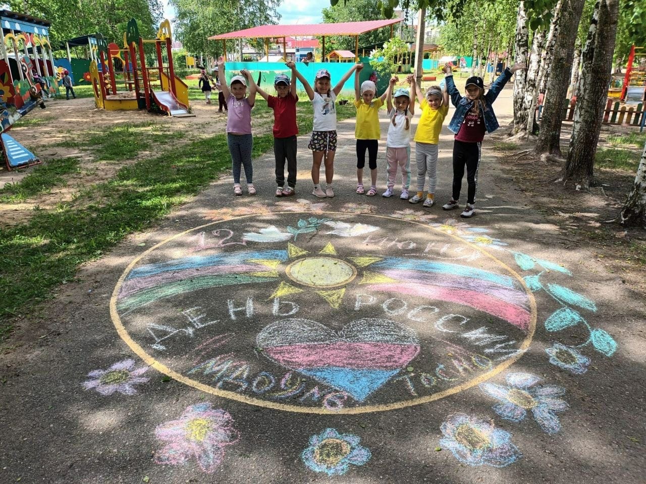 В детских садах Тосно, Никольского и Гладкого дети рисовали на асфальте российские флаги и делали надписи «Мы любим Россию» и «День России».