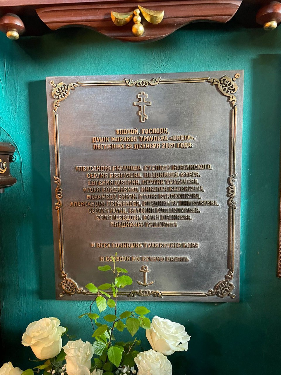 В Мурманске в храме "Спас-на-Водах" установили мемориальную табличку с именами 17 членов экипажа судна "Онега", погибших в Баренцевом море 28 декабря 2020 года. Об этом Север.Реалии сообщила Елена Шевцова, мать погибшего матроса Юрия Шевцова.