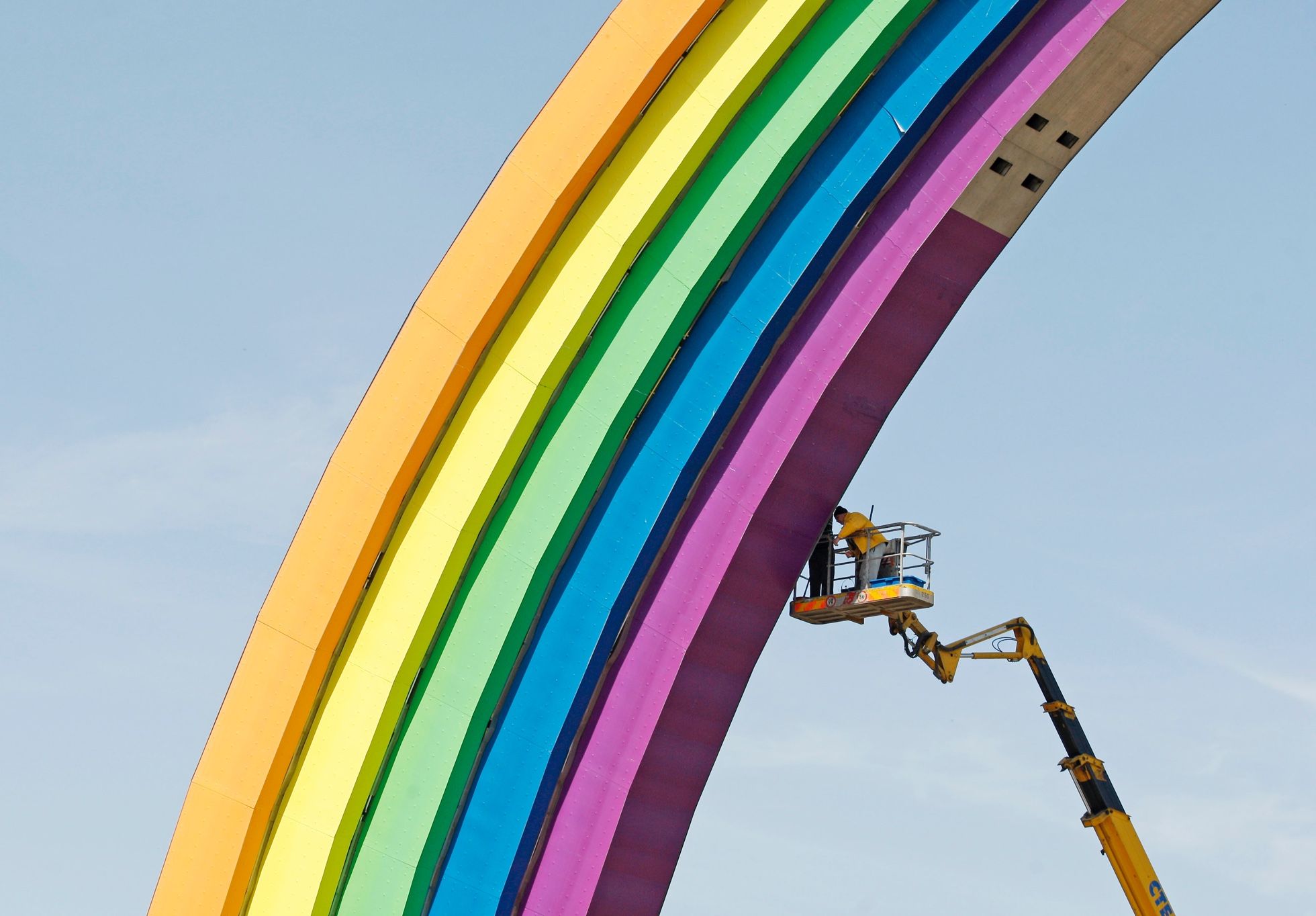 When Ukraine hosted the Eurovision Song Contest in 2017, the arch was temporarily colored to resemble a rainbow and renamed the “Arch of Diversity.” Later, in 2018, rights activists adorned the arch with a sticker that looks like a crack to symbolize the impossibility of friendship with Moscow. The activists said it was a show of support for Ukrainian political prisoners incarcerated in Russia, such as film director Oleh Sentsov and activist Volodymyr Balukh. The crack remains in place to this day.