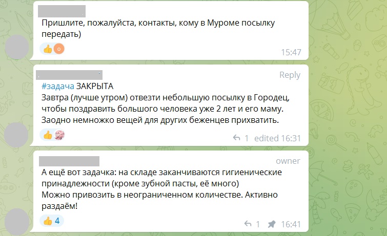– Наша помощь – точечная, у нас прямой контакт с людьми – как с беженцами, так и с волонтерами, – говорит Мария. – Я даже думаю, что мы больше помогаем не беженцам, а тем нашим людям, которые хотят помочь. Для них наш чат – какой-то ресурс, "точка входа", где они могут найти применение своему желанию помочь.