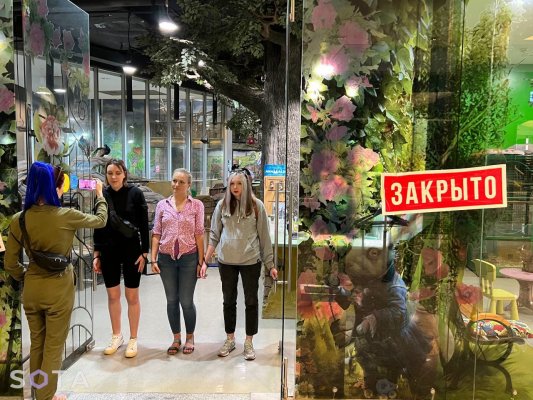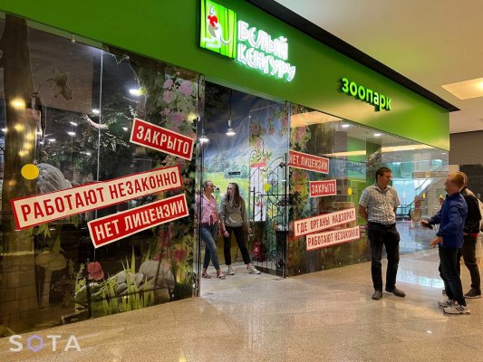 Активисты потребовали прекращения деятельности зоопарка из-за отсутствия лицензии на работу. На витрины заведения они наклеили плакаты «Закрыто», «Нет лицензии», «Работают незаконно» и «Где органы надзора?».