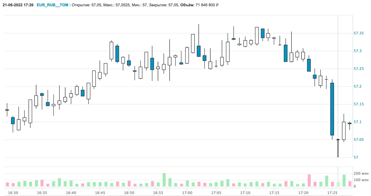 Курс евро опустился до 57 рублей впервые с мая 2015 года