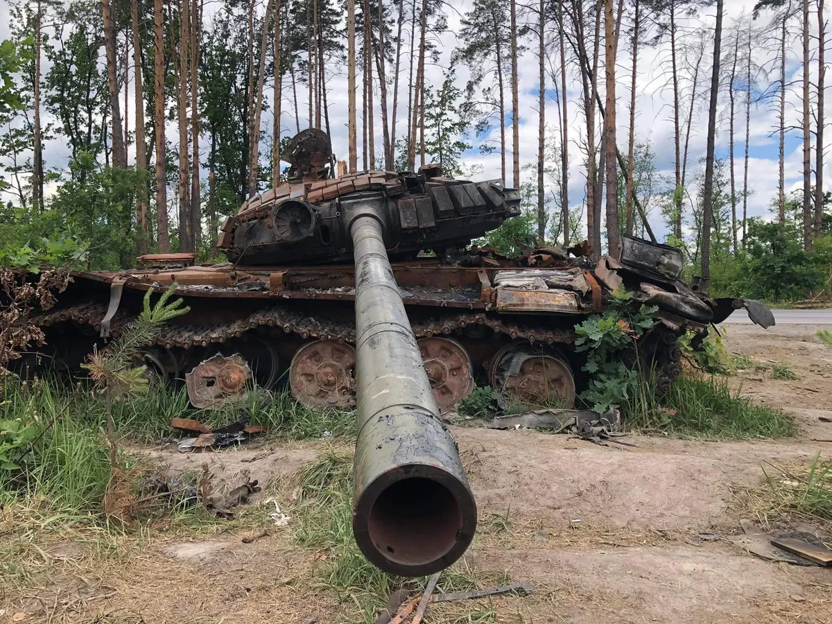 Едем в пригородную Дмитровку, на полигон ГСЧС, присутствовать на презентации инновационной новинки — с помощью искусственного интеллекта собираются искать мины. Оккупантов из Дмитровки вытеснили в конце марта. Танковые дуэли здесь гремели чуть не на каждом углу. Останки российской колонны — удивительно, как быстро ржавеют сгоревшие танки! — оттащили на край дороги. На фоне цветущих кустарников они выглядят декорацией фильма о войне, но легковые машины проезжают мимо. Редко кто из местных водителей или пассажиров выходит сделать фото или хотя бы пнуть ногой. Привыкли? Брезгуют?