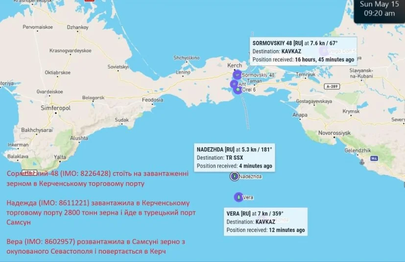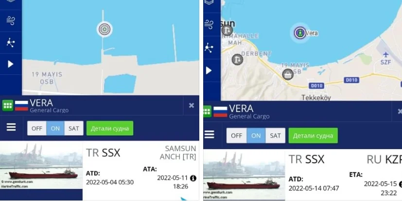 Вот, например, судно с прекрасным именем «Вера» под российским флагом. С выключенным судовым транспондером «Вера» вошла 8 мая в Севастополь, загрузилась на зерновом терминале компании «Авлита», отчалила 9 мая, а на связи в AИC, автоматической информационной системе, появилась лишь на следующий день, со статусом «загружено» и портом назначения, турецким Самсуном. Судно под российским флагом с не менее прекрасным именем «Надежда» последовало примеру воровки «Веры». 10 мая оно зашло, тоже с выключенным АИC, в Керченский торговый порт, приняло в трюм 2800 тонн зерна и отправилось известным курсом — в Самсун. К тому времени пустая «Вера» уже спешила назад, в Крым, за новым товаром. 14 мая на воровстве был замечен «Сормовский-48». Перед тем, как пройти арку моста, он выключил транспондер, пришвартовался в Керчи, загрузил 3000 тонн кукурузы и проследовал в Самсун.