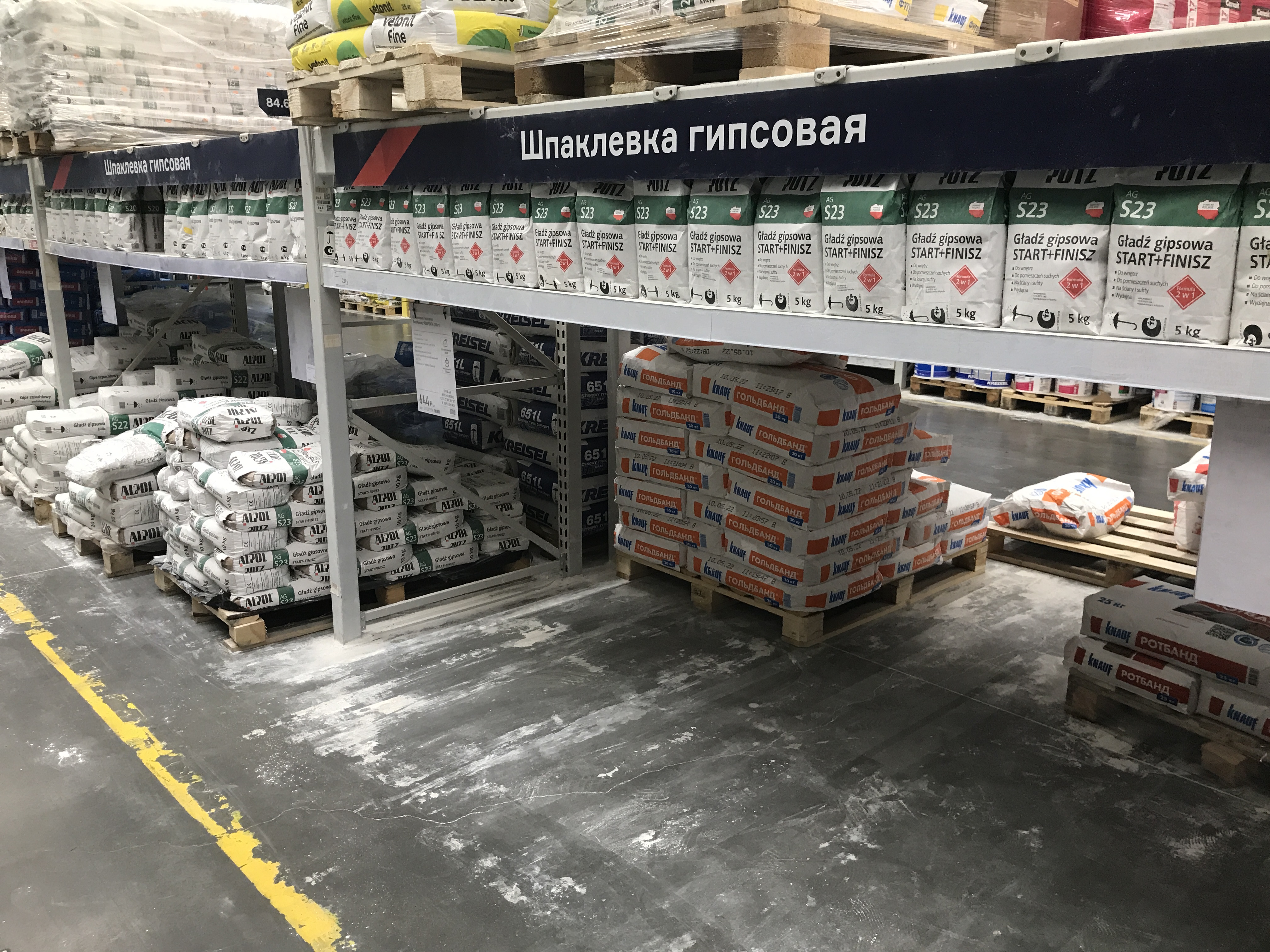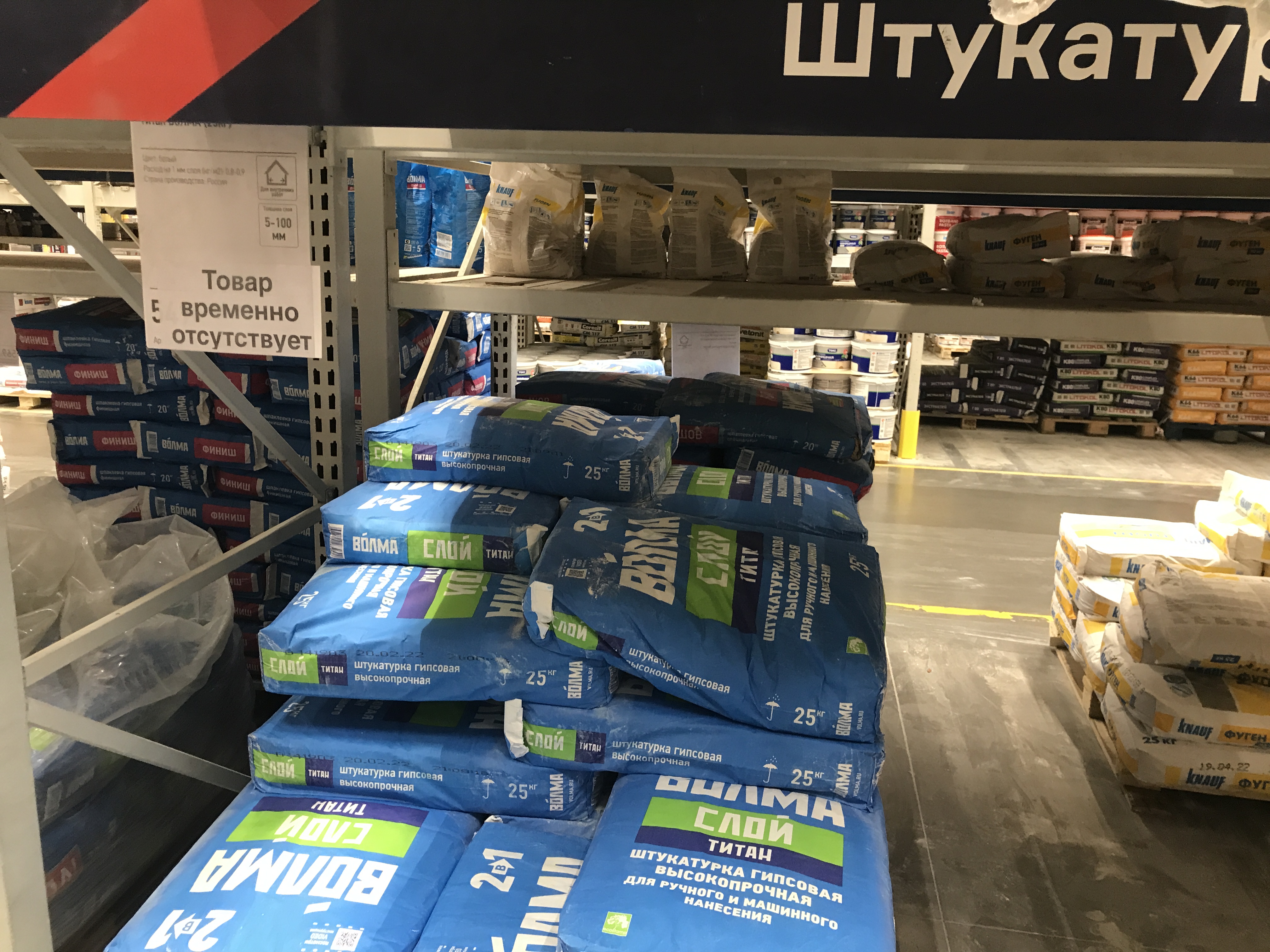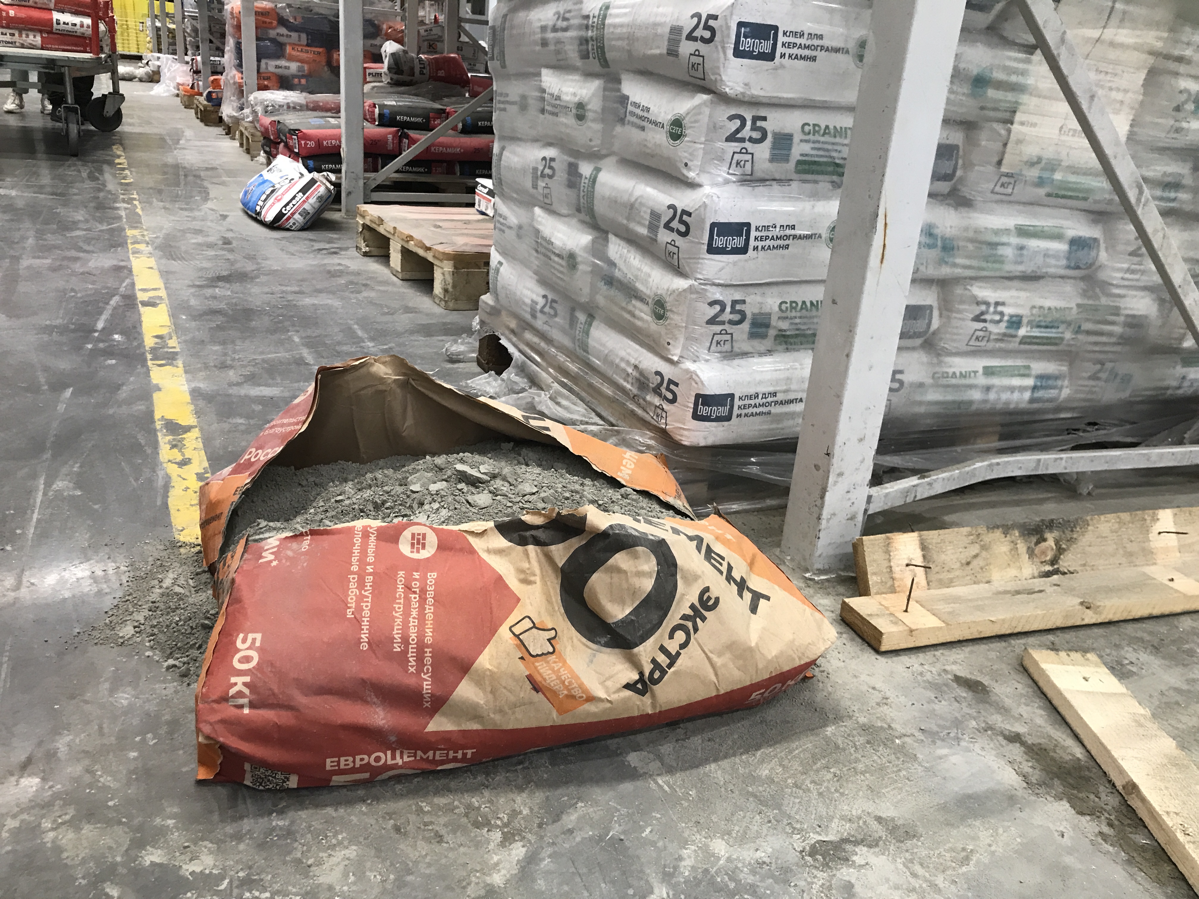 В строительном супермаркете "Бауцентр" днем в понедельник осталась последняя упаковка цемента, и та разорванная. Между рядами грустно ходят покупатели, которые не успели закупиться.