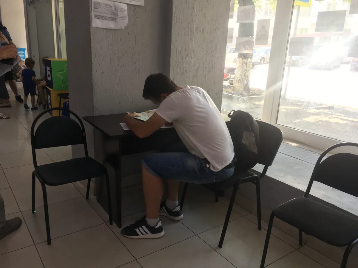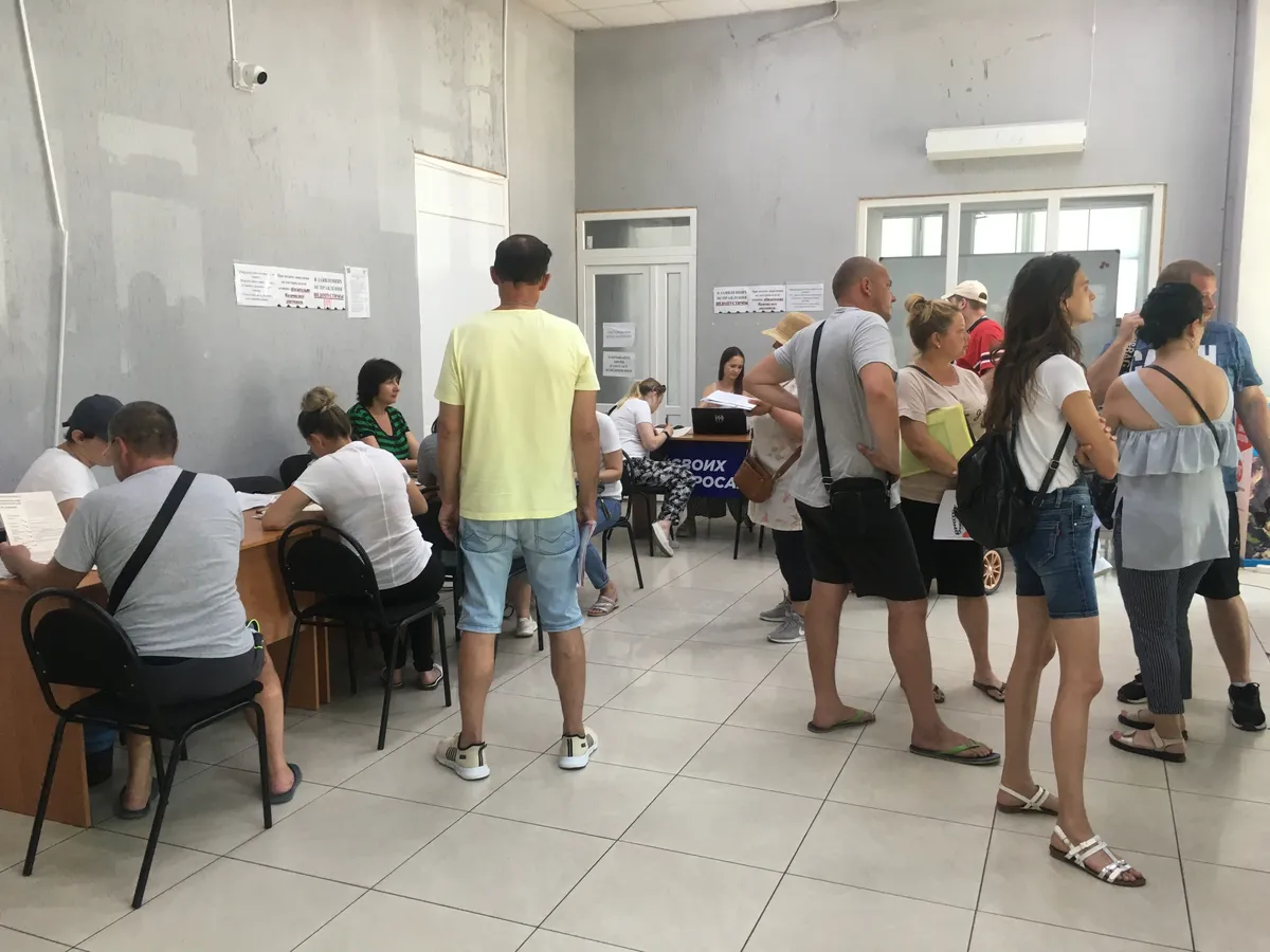 Во время перерыва возле «Мы вместе» образовалась очередь около 25 человек. Мужчины, женщины, маленькие дети, пенсионеры. Они одеты чисто, но бедно. Пока ждут, обсуждают бюрократию, новости с малой родины, сложности с работой.