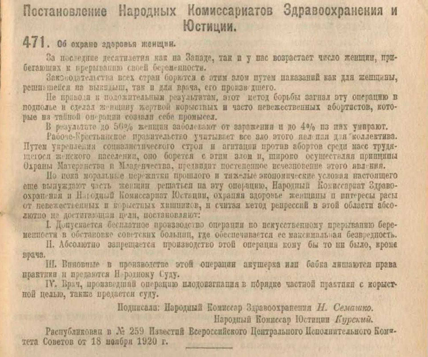 В 1920-м Советский Союз стал первой страной в Европе, которая легализовала аборты. Однако законодательство было либерализовано не для того, чтобы дать женщинам выбор, а для того, чтобы обезопасить их от подпольных абортов — до тех пор, пока условия при социализме не привели бы к постепенному исчезновению потребности в аборте. Таким советские руководители видели идеальное будущее.