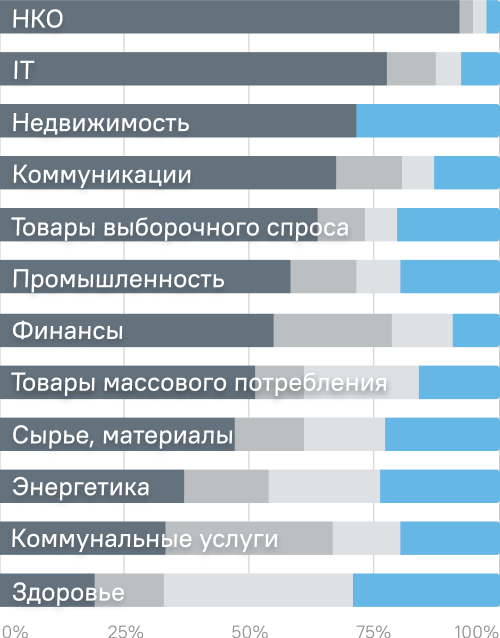 Больше всего зарубежных фирм было в промышленности — 25% от всех иностранных. Выше всего доля остановивших бизнес или полностью ушедших компаний — в сфере НКО — 92%, а также IT — 77%. Из сферы энергетики ушла каждая третья иностранная компания. Частично сократить операции предпочли 33,3% фирм сферы ЖКХ. 67% фармкомпаний оказались в группе лишь незначительно ограничивших свою активность или продолживших ее.