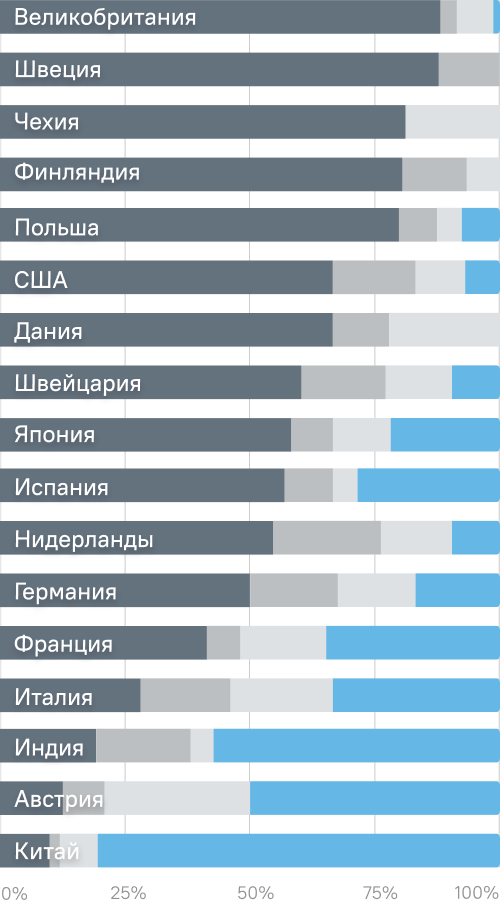 Компаний, которые ушли/остановили производство, сократили производство, незначительно ограничили и продолжили бизнес, страны, %