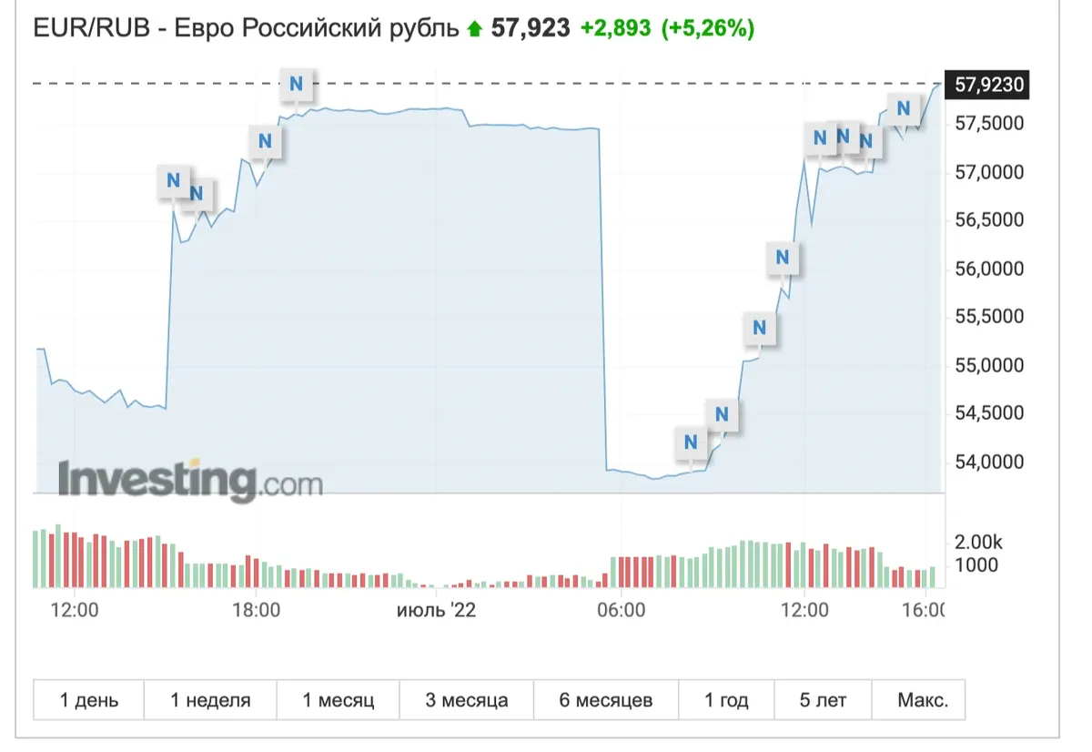 Курс евро вырос на 5% и составляет на момент написания новости (16:39 мск) почти 58 рублей.