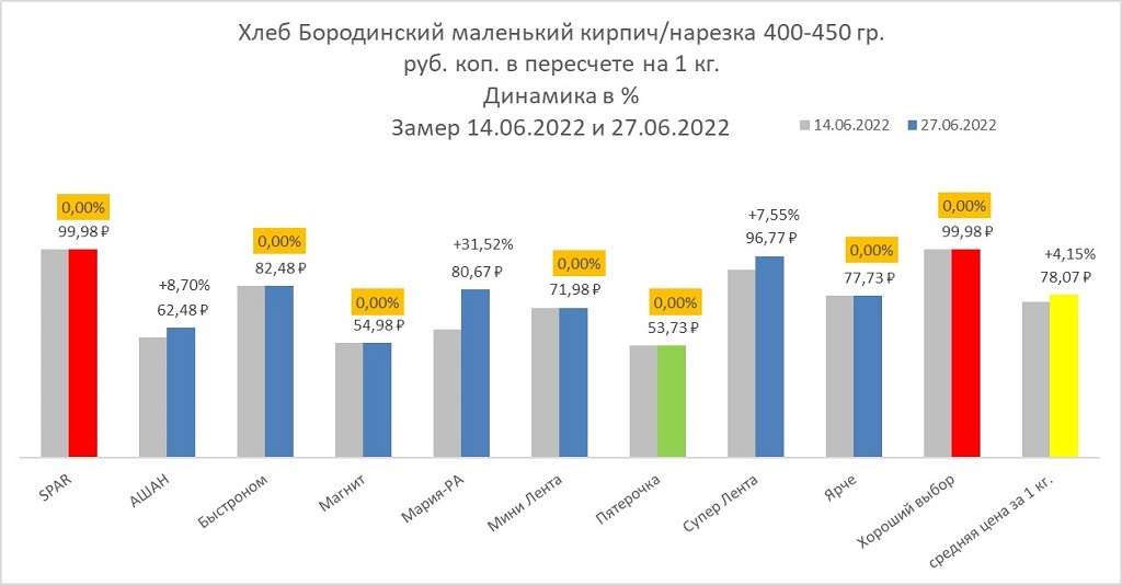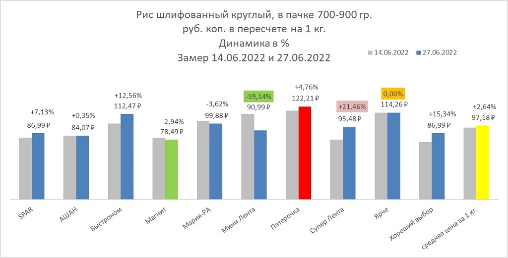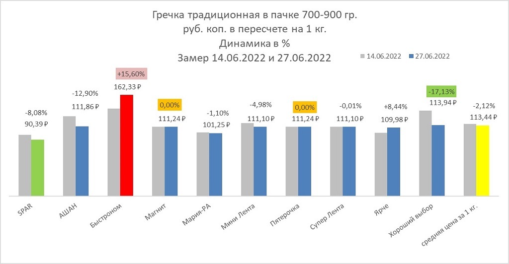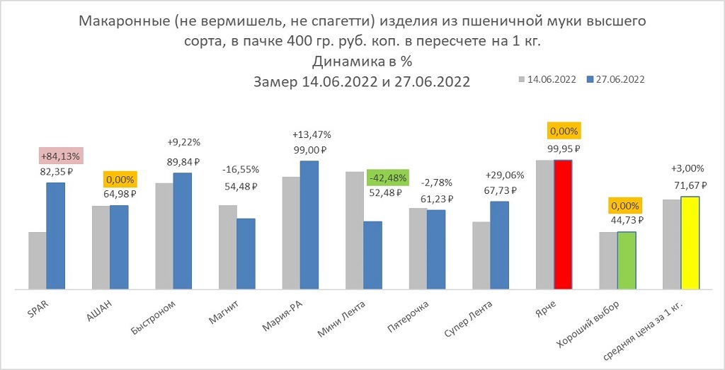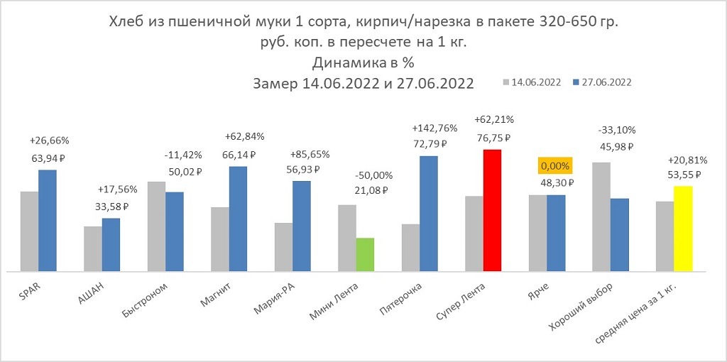 Мониторинг проводился в 20 торговых точках во всех районах города. Сравниваем цены за 14 июня и 27 июня.