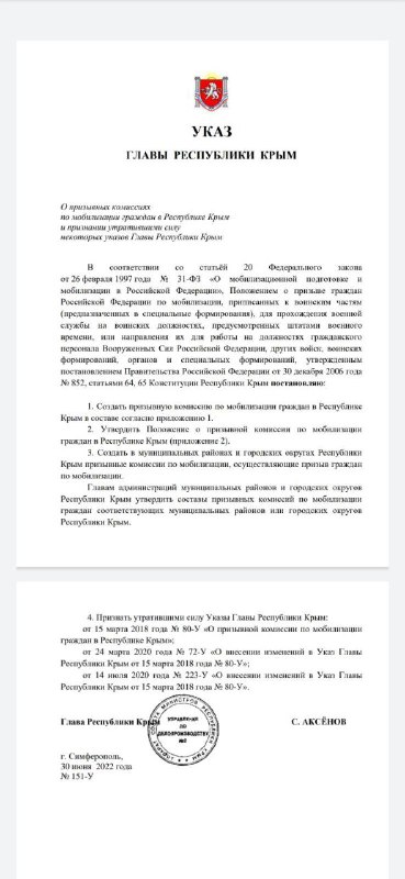 На сайте правительства Крыма в указе главы республики Крым №151-У, подписанном главой региона Сергеем Аксеновым, утверждается создание призывных мобилизационных комиссий. Также призывные комиссии по мобилизации должны быть созданы в муниципальных районах и городских округах. Все это проводится в рамках ФЗ-31 «О мобилизации».