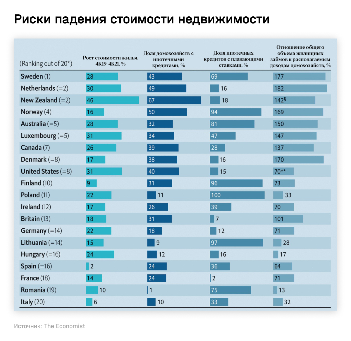 Среди рисков — более серьезное ужесточение, чем сейчас того ожидают рынки, отмечают в Goldman Sachs. The Economist составил рейтинг стран с наибольшими рисками падения стоимости жилья. В расчете издание учитывало несколько факторов: