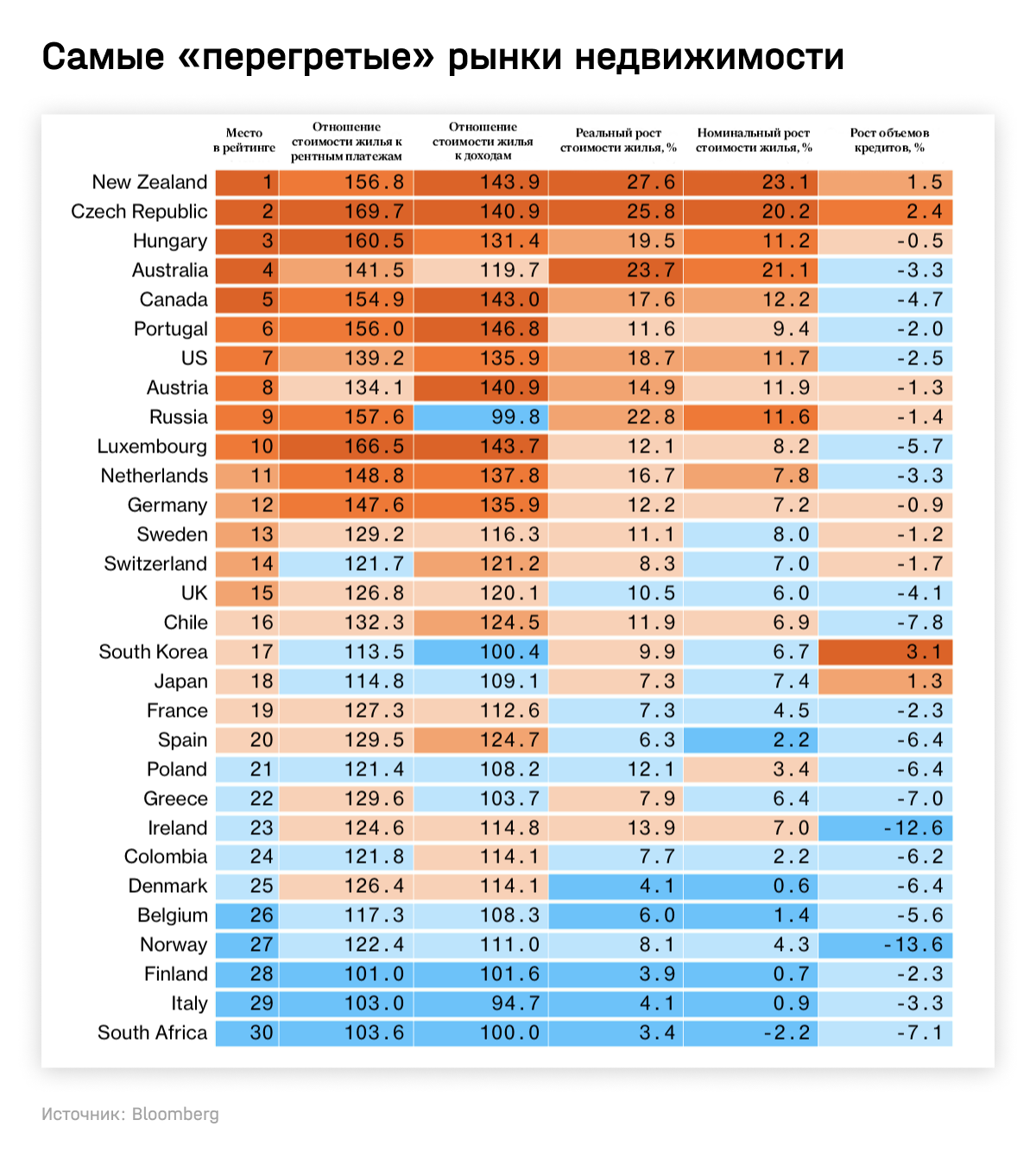Как итог — во многих странах рынок жилья оказался в состоянии «пузыря», пишет Bloomberg. Анализ, проведенный Bloomberg Economics в 19 странах ОЭСР, показал, что отношение стоимости жилья к рентным платежам, а также к доходам сейчас во многих странах выше, чем перед мировым финансовым кризисом. Наиболее «перегрет» рынок в Новой Зеландии, а также в некоторых странах, популярных среди россиян с точки зрения покупки недвижимости, — Чехии, Португалии, Австрии и др. Россия оказалась в списке на 9-м месте.