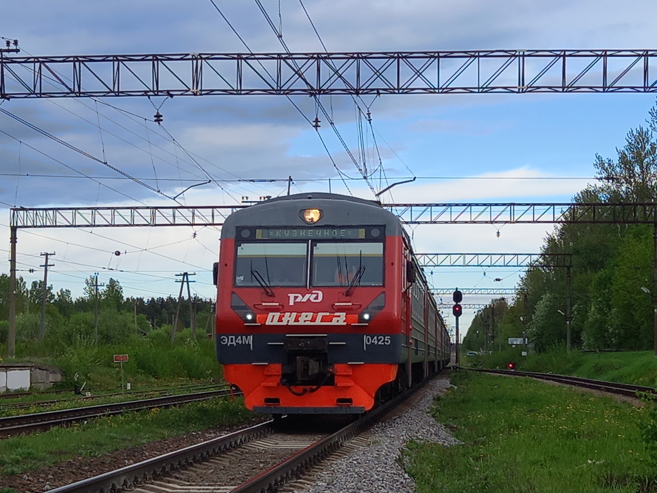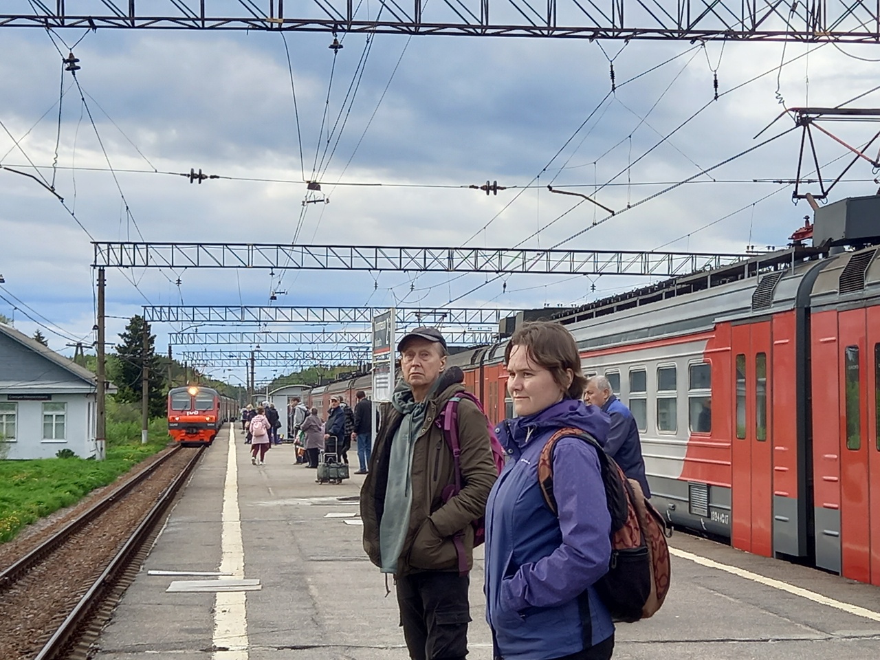 Две электрички расходятся на станции. Наша подъезжает, освобождая путь для электрички из Петербурга.
