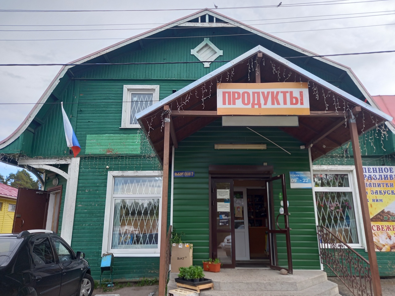 Идем к автобусной остановке, чтобы вернуться на станцию. Видим магазин в старом деревянном доме. Тут и продукты, и разливное пиво, и закуски к пиву - в общем, все самое главное для жизни в этом поселке.