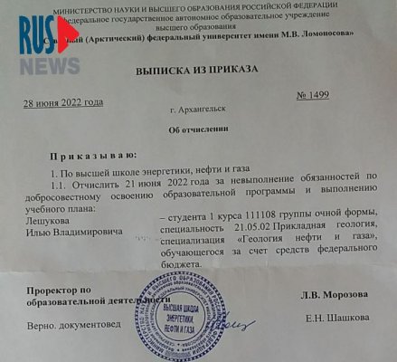 Ранее Лешуков просил предоставить ему академический отпуск из-за отъезда из России, но получил отказ. Тогда, понимая, что не он успевает вернуться к сессии, студент подал 22 июня заявление на отчисление. Документ вуза об исключении датируется днем ранее. Активист уверен, что бумагу подписали «задним числом». В ней причиной исключения Лешукова значится «невыполнение обязанностей по добросовестному освоению образовательной программы и выполнению учебного плана».
