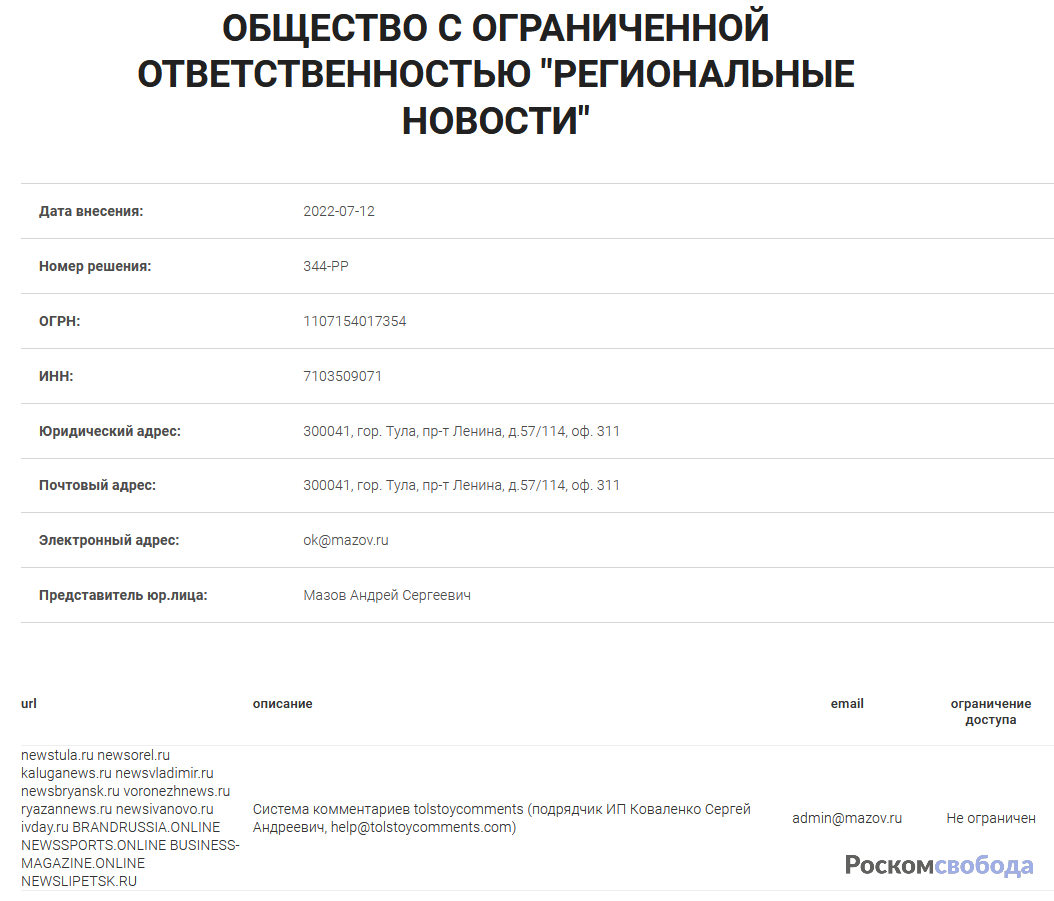 В ходе мониторинга реестра организаторов распространения информации (ОРИ) мы обнаружили там ещё одного «новобранца» – ООО «Региональные новости»: