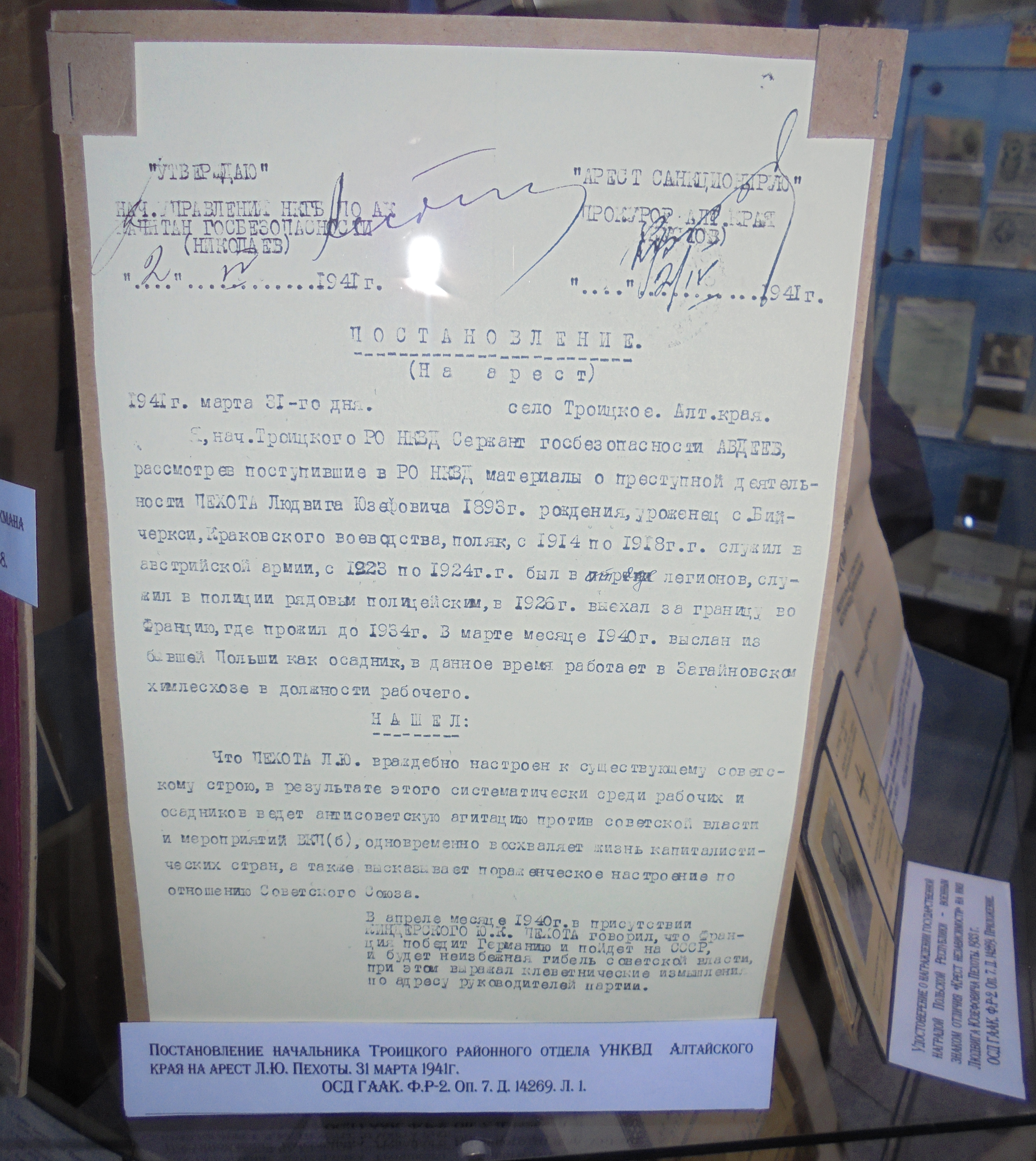 В государственном архиве Алтайского края работает выставка "В ходе следствия обнаружены…". Представленные здесь документы –свидетельства тех испытаний, которые выпали на долю репрессированных и сосланных в Сибирь поляков. Рабочий Людвиг Пехота был арестован 31 марта 1941 года Троицким районным отделом НКВД и сослан в Сибирь. Работал вздымщиком – добывал смолу хвойных деревьев в местном лесхозе.