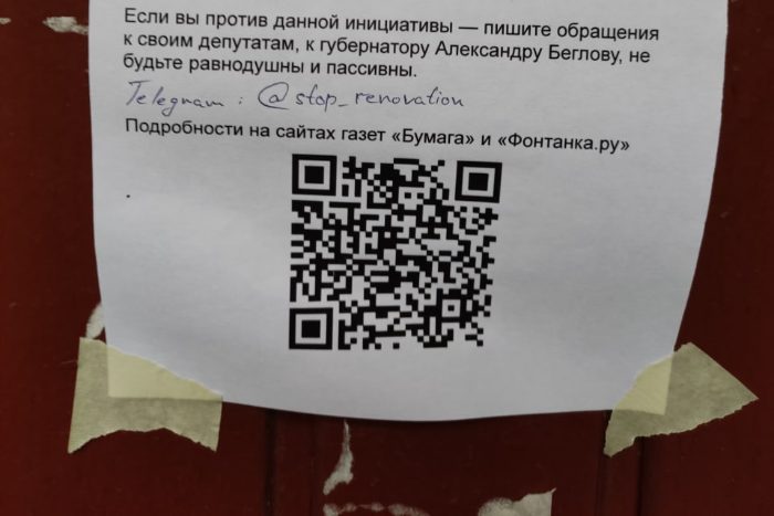 На листах есть QR-код, который ведет в чат «Реновация СПб». В нем обсуждают последствия принятого законопроекта. Согласно чату, листовки вешают как минимум на домах в МО «Новоизмайловское» и МО «Малая Охта».