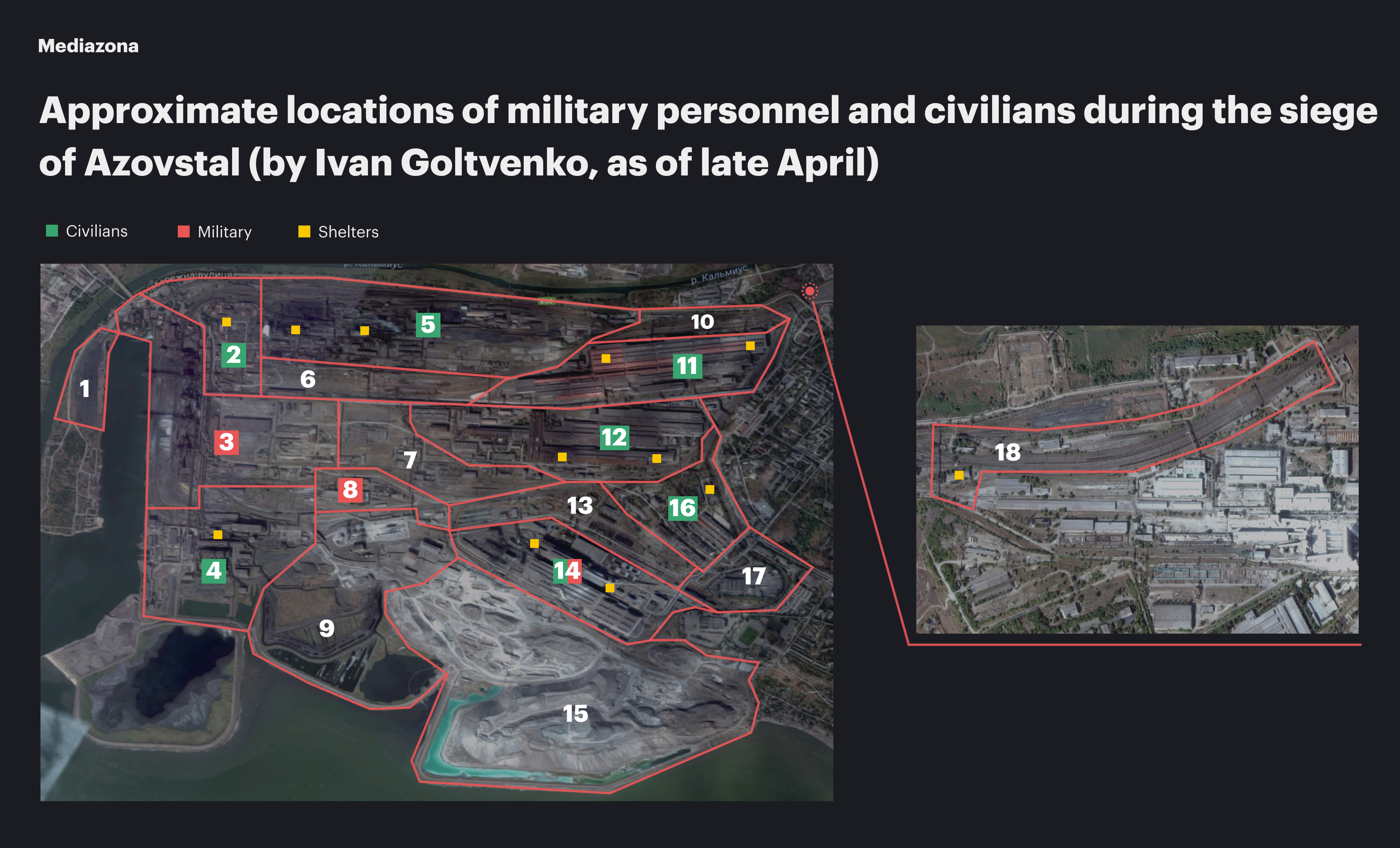 Approximate locations of military personnel and civilians during the siege of Azovstal (by Ivan Goltvenko, as of late April). Civilians are shown in green, military in red, shelter locations in yellow.