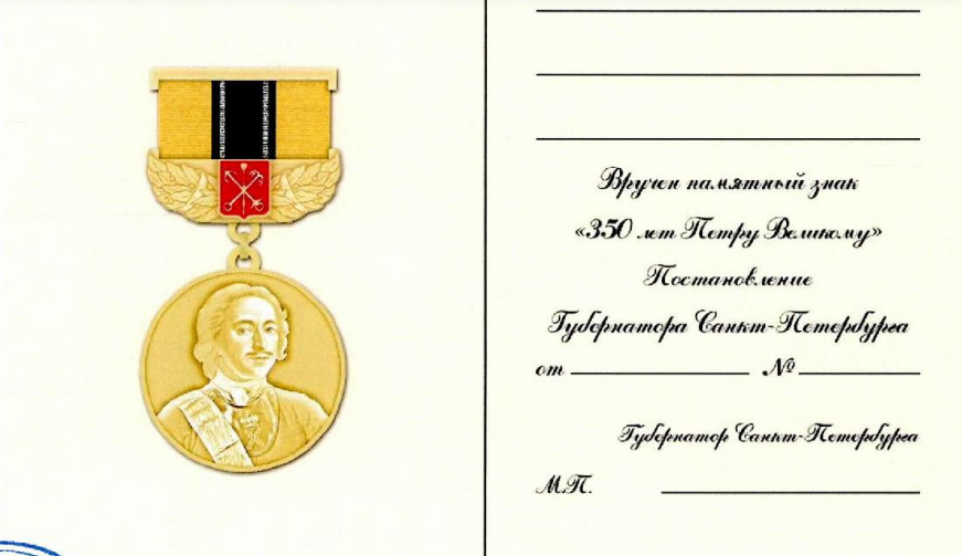 - Знак «350 лет Петру Великому» придумали в Смольном. 20 мая губернатор Петербурга Александр Беглов учредил его постановлением правительства.