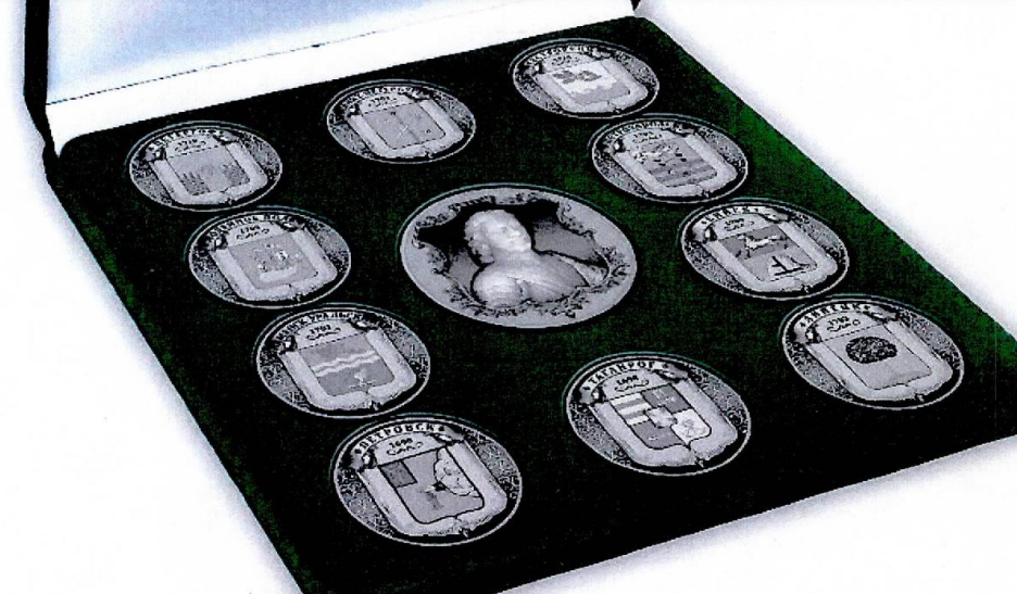 - Набор из одиннадцати медалей. К знаку и удостоверению вручается еще и набор из одиннадцати медалей, отчеканенных из медно-никелевого сплава. На центральной медали диаметром 6 сантиметров написано «Петр Великий, основатель Российской империи, русского флота, русских городов». На остальных медалях — диаметром 4,2 сантиметра — нарисованы гербы десяти городов и надписи: «Санкт-Петербург, 1703», «Петергоф, 1705», «Сестрорецк, 1714», «Лодейное Поле, 1702», «Петрозаводск, 1703», «Каменск-Уральский, 1701», «Бийск, 1709», «Петровск, 1698», «Таганрог, 1698», «Липецк, 1703».